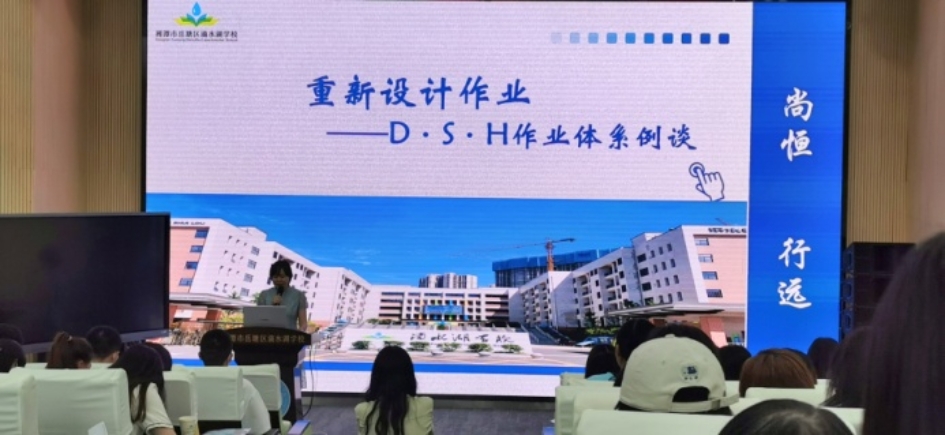 见习活动的第三个环节,是小学教育领域的热点问题研讨、讲座,主要由副校长袁素芬和校长曹峰主讲。副校长、高级教师袁素芬结合国家的双减政策背景,系统地介绍了滴水湖小学的“D·S·H作业体系”设计的思路与内容。该体系从基础性作业和研究性作业两方面进行系统地设计,创造地提出了“卡片式”课内作业、“大阅读+语文”的混合式作业、“大阅读+数学”的递进式作业和“大阅读+常科”的并列式作业等等,生动展现了学校在落实“双减”政策要求的过程中如何确保学生学业质量的作业设计。