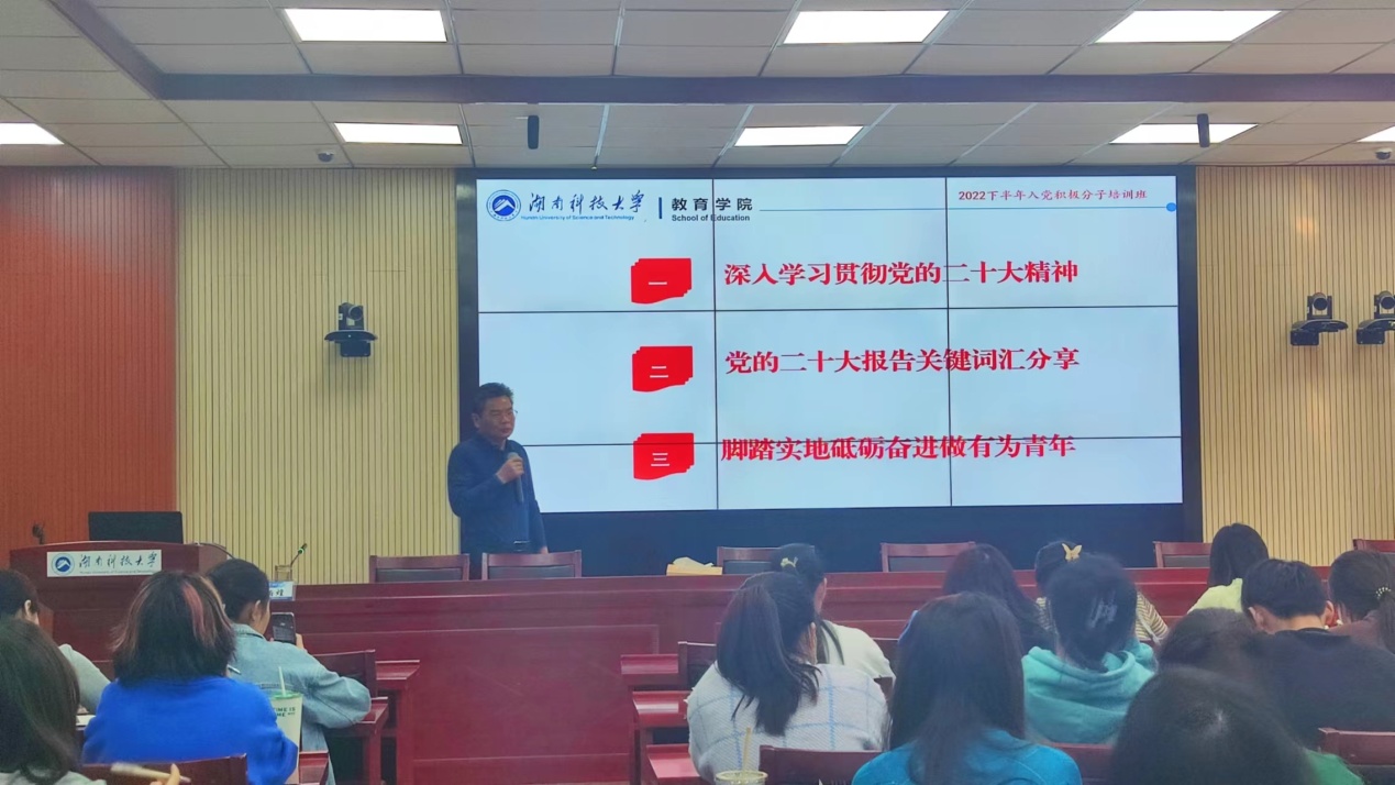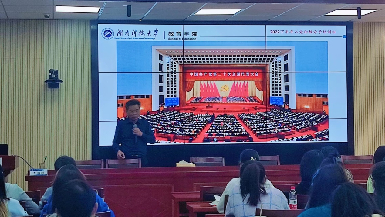 20221018日下午,教育学院2022下半年入党积极分子培训班首次党课在第八教学楼308学术报告厅开讲,全体学员认真听取了院党委书记李炳煌为入党积极分子讲授的“深入学习贯彻党的二十大精神,脚踏实地砥砺前行做新时代好青年”主题党课。
