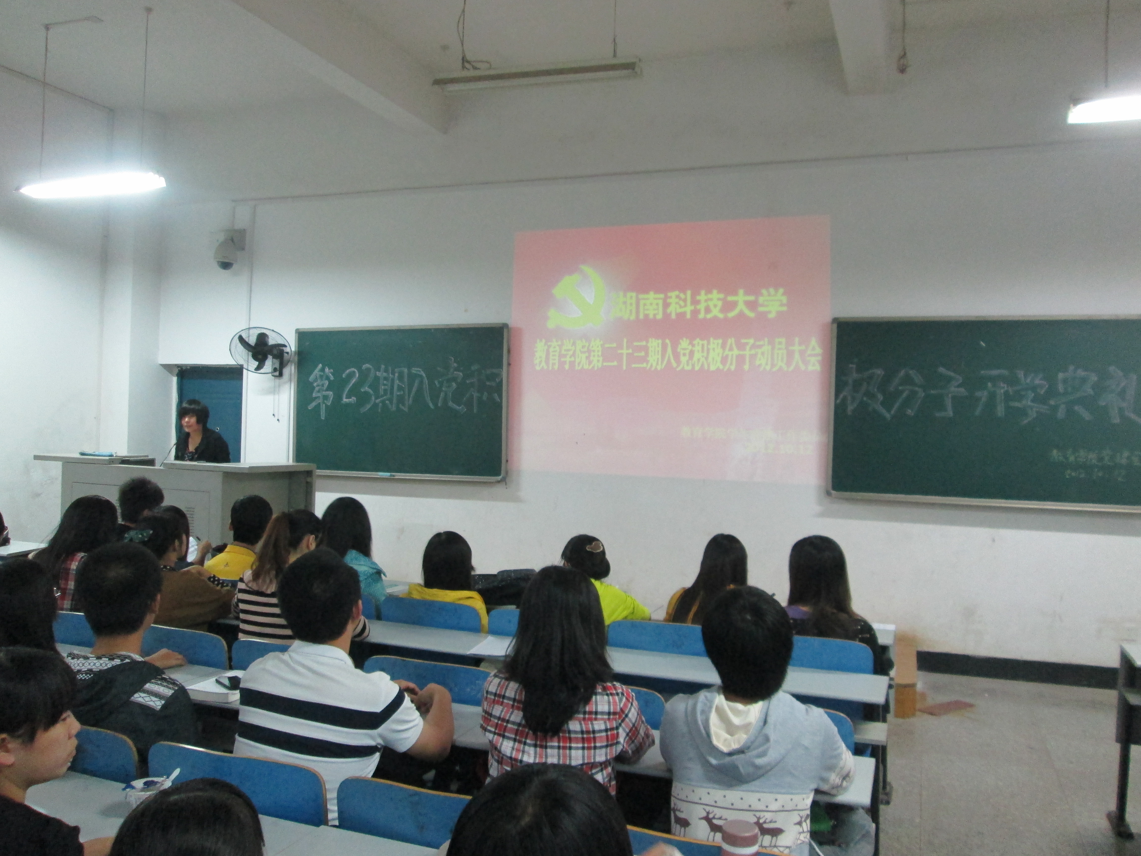 为贯彻学院党委关于学生党建工作要求,教育学院学生党支部于10月12日晚在第八教学楼1—5教室举行了第二十三期入党积分子动员大会,对我院选拔出的120名入党积极分子做培训动员。我院学生党建工作委员会副书记杜佳同志,研究生团委副书记阳丹同志,以及党建会各个部长、各学生支部副书记出席了本次动员大会。