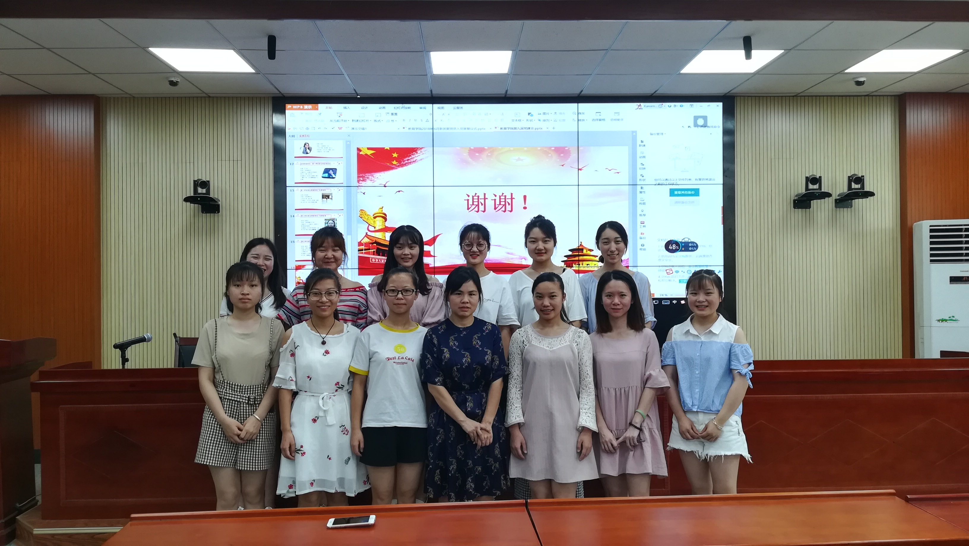 随后进行的是教育学院第九届党建会换届大会,由第八届党支部副书记唐彬滢主持,首先,胡银华老师为第八届党建会成员下发聘书并合影留念。在轻松愉悦的氛围下,第九届学生党建工作委员会的成员依次上台做自我介绍,她们不忘初心,砥砺前行,说出自己的工作宣言,不求最好,但求更好,相信新一届党建会成员的每一个人都会用细心、耐心、责任心来对待自己的工作。最后由胡银华老师作总结发言,她首先对第八届党建会成员表达了深深的感谢,对于第九届的新成员也表示欢迎和期望,希望教育学院党支部的工作越做越好!