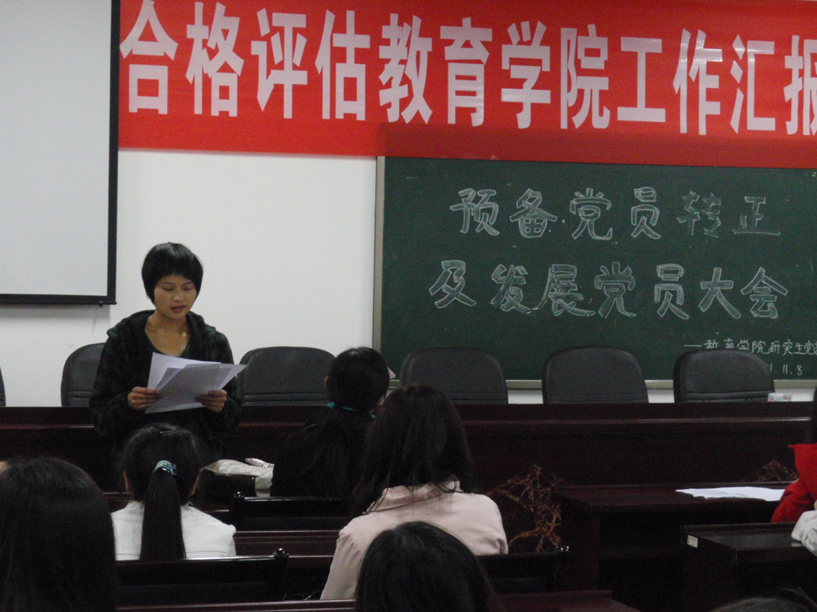 11月8日下午4点,教育学院预备党员转正暨新党员发展大会在八教408室隆重召开。大会共同讨论了包文婷、彭礼等6位预备党员转正及邓乐江、莫沙等8位学生的组织发展问题。本次会议由前院研究生会副主席王江南主持,院党委副书记王伟清、支部书记练素华老师、全体党员与会。