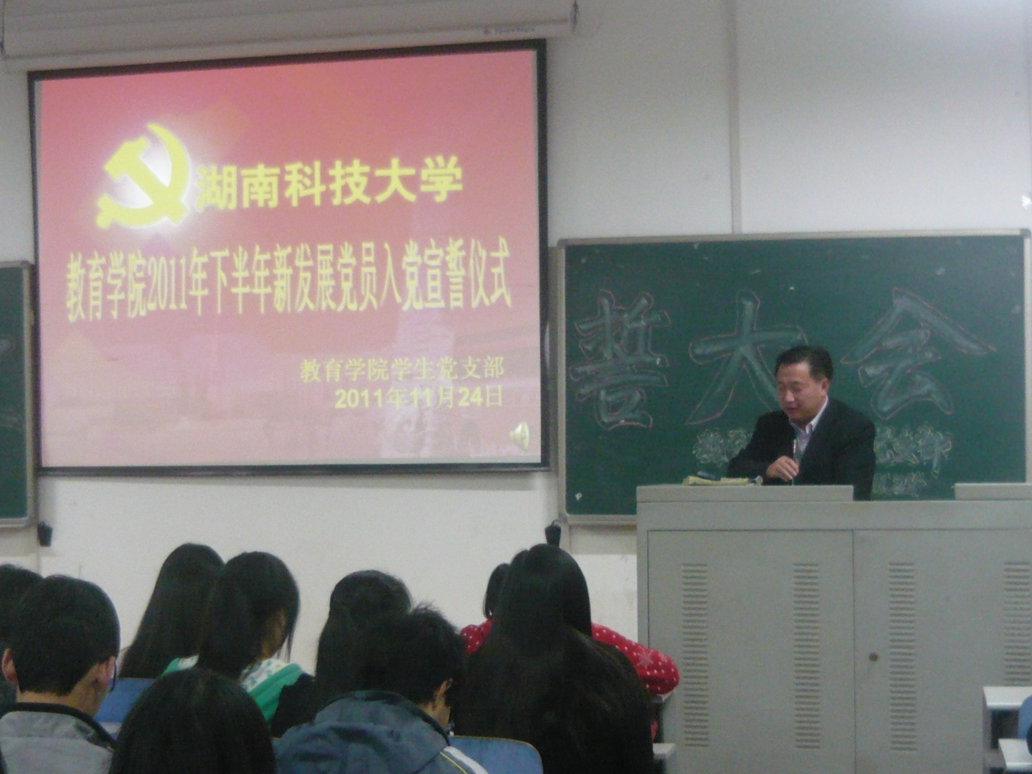 11月24日19时,在国际歌庄严而激昂的旋律和同学们的肃穆眼神中,2011年教育学院党员宣誓大会正式开始。党委书记谭建平同志,研究生党支部书记练素华同志,本科党支部书记胡银华同志参加了此次会议,大会由院党委副书记王伟清同志主持。