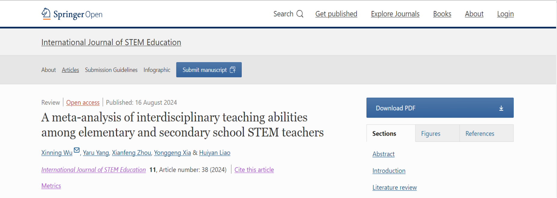 近日,我院教育技术学系教师吴新宁等在《International Journal of STEM Education》上发表长篇论文,论文题目为“A meta-analysis of interdisciplinary teaching abilities among elementary and secondary school STEM teachers”。该期刊由Springer International Publishing出版社出版,是一本国际权威期刊,属于中科院SCI一区、JCR SSCI Q1区和SCIE Q1区。根据最新数据,该期刊2023年的影响因子为5.6,CiteScore指数值为12.4。