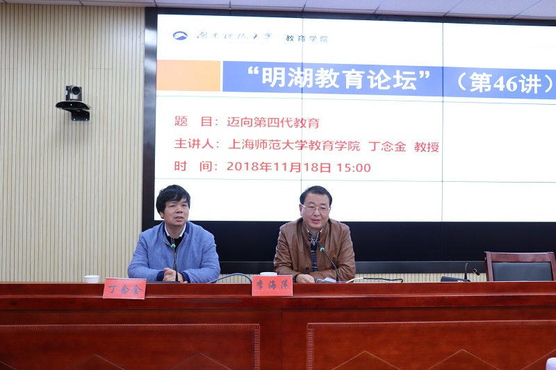 2018年11月18日下午,上海师范大学教育学院博士生导师丁念金教授做客“明湖教育论坛”,为我院师生带来题为“迈向第四代教育”的学术报告。报告会由教育学院院长李海萍主持。