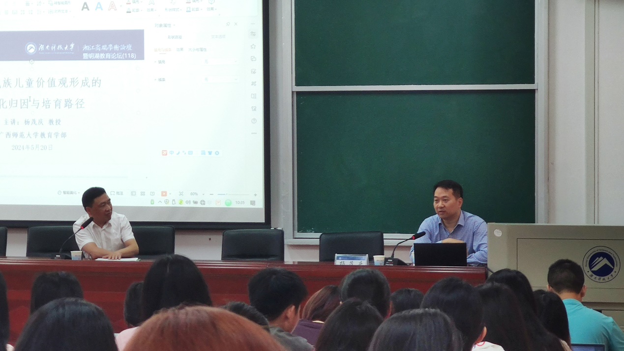 5月20日上午,广西师范大学教师教育学院院长、教育学部副部长杨茂庆教授做客“明湖教育论坛”,在昭潭书院第二教学楼102报告厅为我院师生带来“少数民族儿童价值观形成的文化归因与培育路径”的学术讲座。教育学院教师代表、2022级、2023级研究生参加,讲座由教育学院院长谭千保主持。