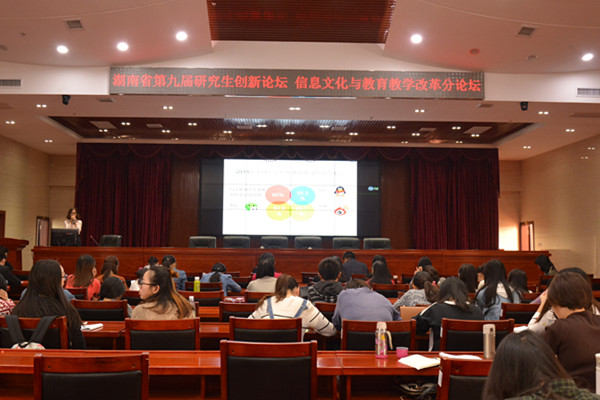 湖南师范大学教育学院研究生崔阳阳带来的《慕课时代背景下对教师角色认识》的论文报告拉开了序幕。她从“传统教师角色的溯源和现代教师角色的思考”两方面展开讲解,对大数据时代下教师角色的定位提出了建议。接着,湘潭大学公共管理学院研究生赵友华题为《信息文化下研究生社会主义核心价值观培育的困境与对策》的报告,把当前研究生社会主义核心价值观培育的现状和原因进行分析,并提出研究生社会主义核心价值观培育的有效途径。随后,湖南农业大学教育学院谭怀芝采用独特视角,进行题为《系统型随机学习:现代职业教育课堂新模式——以黑龙江省佳木斯市技学校物流专业为例》的报告,从“构建系统型随机学习课堂模式的重要性、系统型随机学习课堂模式的构建过程、构建系统型随机学习课堂模式的主要成效”三方面入手,阐述了构建系统型随机学习课堂模式的优点、影响。最后,我校教育学院研究生赵梦莹和刘房芝分别进行题为《大学生媒体素养现状及其教育反思》、《“iPad+App”进入中小学课堂研究》。赵梦莹为现场师生介绍了我国大学生“媒体素养”现状与该如何面对大学生媒体素养教育问题的策略,提出了关于大学生媒体素养亟待解决的问题的研究方向;刘房芝对“iPad”教学设备、“App”以及“iPad+App”教学模式进行介绍,并从“iPad+App”教学模式在中小学教学及管理中的应用、“iPad+App”课堂带来的挑战、合理开展“iPad+App”教学及教学管理的建议等方面进行分析,为传统的教学模式带来了一种新视角。