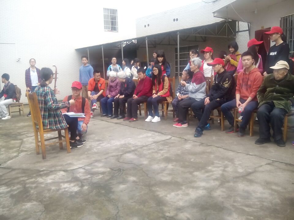 今天早上七点五十集合完毕之后,志愿者们便乘车加步行来到先锋乡老年乐园。来到敬老院才发现,此次的爱心之旅还有湖南科技大学潇湘学院,艺术学院青年志愿团、红十字社团的志愿者。在征得敬老院院长的同意之后,志愿者们纷纷进入敬老院开始志愿活动。因为怕人太多会打扰老人的休息,各学院志愿团负责人一再强调要注意队员和老人的人身安全,注意言谈举止,用礼貌的方式使老人们身心愉悦,让他们感受到温暖。活动中,志愿者们陪老人聊天,拉二胡,下棋等,还帮助老人打扫房。9:20左右,开始表演节目。教育学院负责场外表演,对于一些腿脚不方便的老人,红十字社团的志愿者为老人进行室内节目表演或遵循老人的意愿,陪他们聊聊天就好。经过这段时间的排练,教育学院志愿团共有十三个节目新鲜出炉。有集体舞《青春修炼手册》和《小苹果》、《还珠格格》经典台词串烧、《经典歌曲串烧》,还有各种合唱或独唱歌曲,如《女驸马》、《一个像夏天,一个像冬天》《夫妻双双把家还》等。志愿者们嘹亮的歌声,搞笑的小品给老人们带来了开心的笑容。在表演《还珠格格》时,因为演得太逼真,引得一位老人频频喊表演就表演,不要打人,引得众人哭笑不得,只怪教育学院的志愿者们演技太好啦。