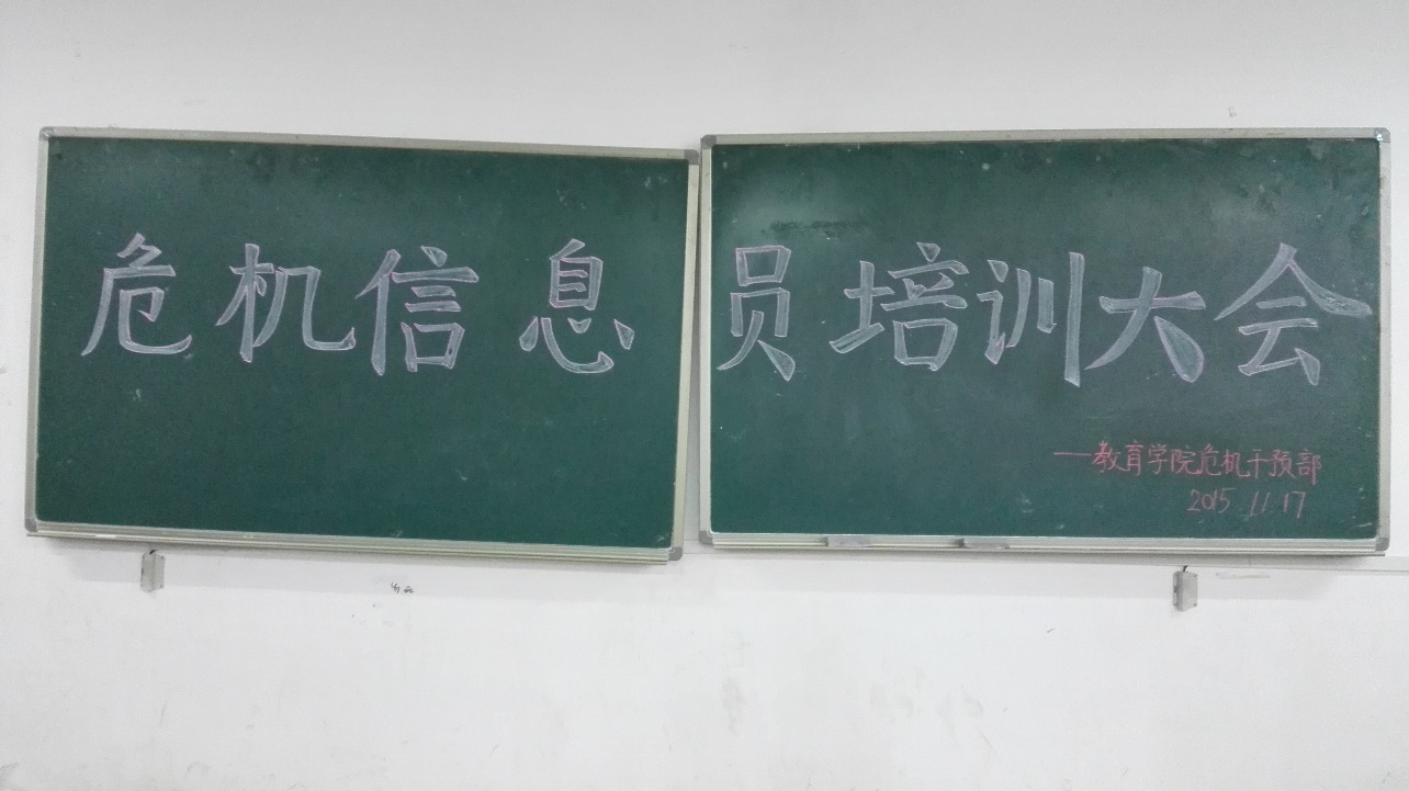 为了响应学校心理健康工作的改革方案。教育学院危机干预部在2015年11月17日于八教1-4组织召开了12、13、14、15级所有危机信息员的培训大会,这是本学期以来的第二次大型会议。本次会议主要讲解了新的工作安排,解决了危机信息员在工作中遇到的问题,了解了各级各班危机信息员的工作情况。出席本次会议的有:教育学院心理辅导员老师练素华、团委学生会副主席兼危机干预部部长肖雨薇同学、以及危机干预部的全体成员。会议由危机干预部部长主持召开。