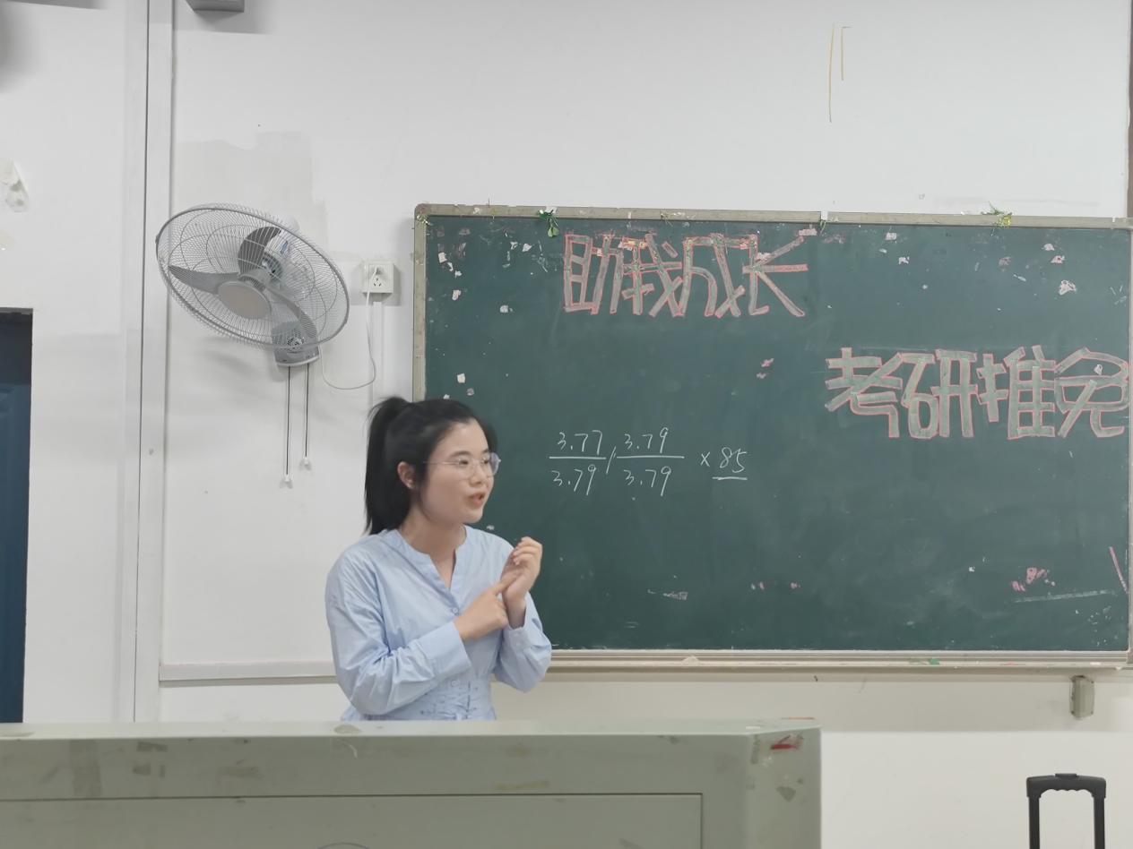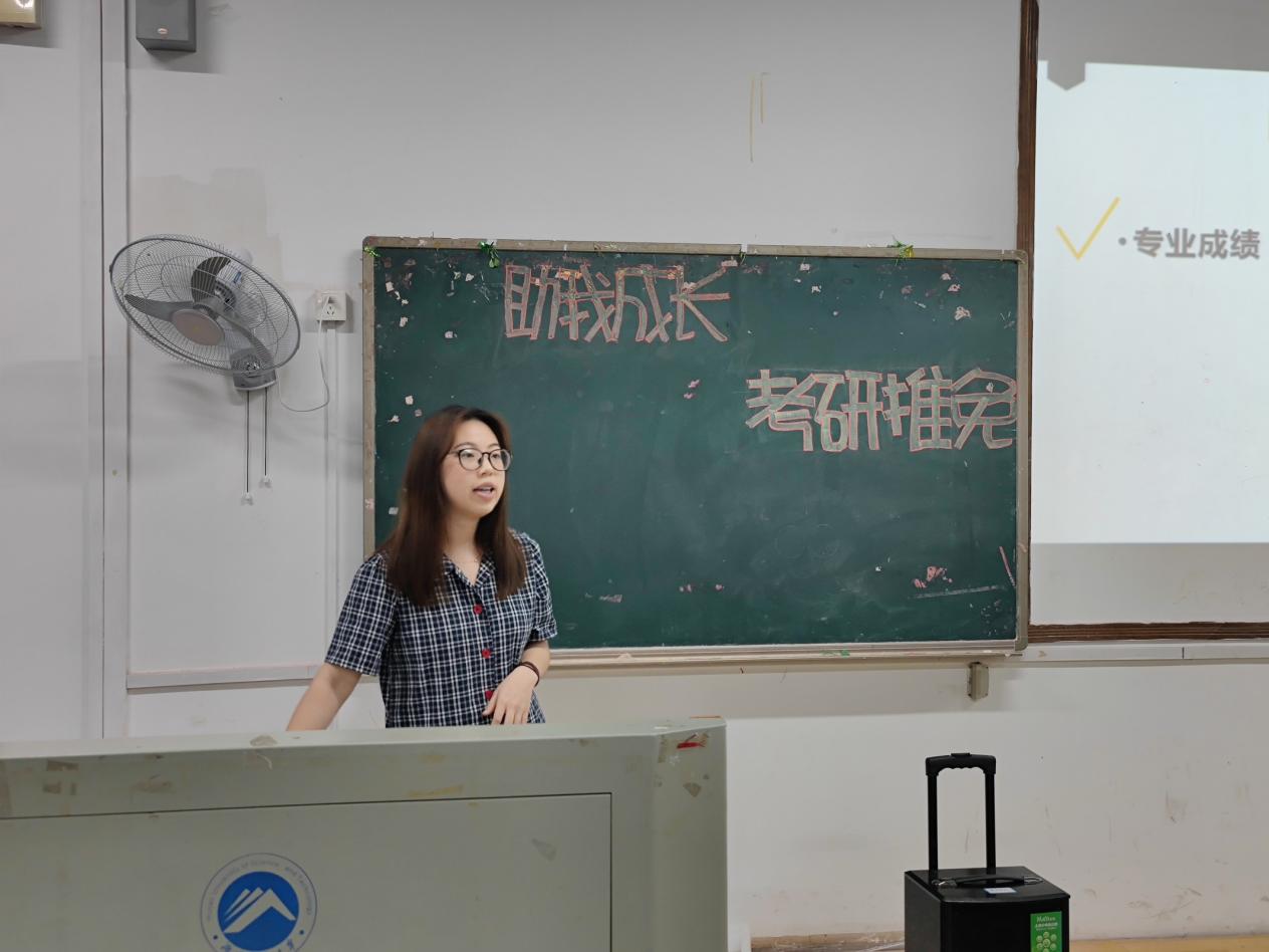 讲座正式开始,王超男分享了自己的推免经验,从个人情况、推免前、推免时和推免后四个方面来全面地介绍了她的推免全过程。她指出推免前的准备是最为重要的,而专业成绩优异和英语水平高又最为重要。同时,她还鼓励在座的学生要积极参加各类大型比赛、准备科研论文和报名夏令营,这有利于提高推免的成功率。随后,王超男又说明了在推免中和推免后应该注意的事项,同学们持续关注院校通知,提前做好准备,并在得知结果后尽早与院校心仪导师取得联系,适应研究生的生活。