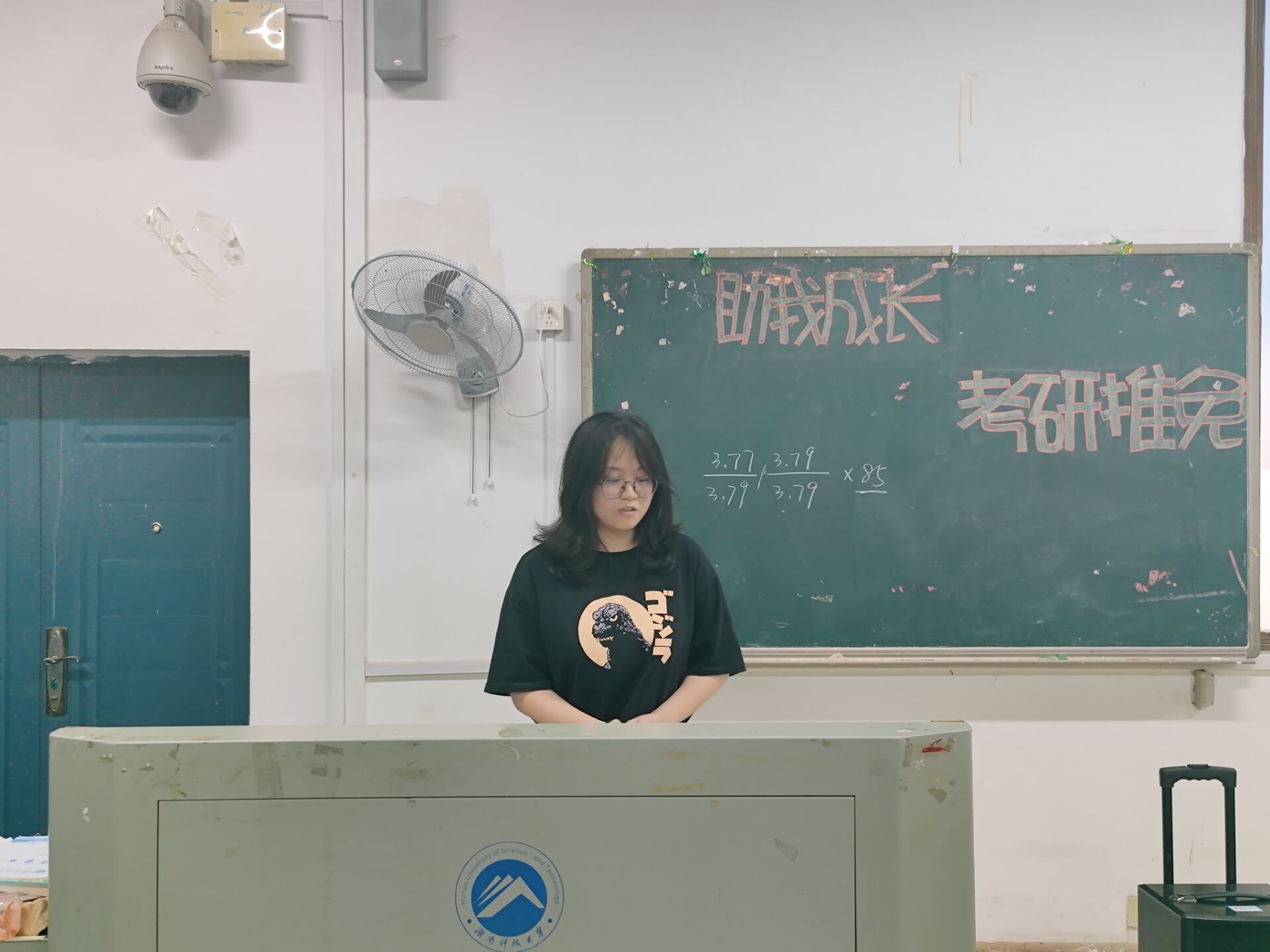之后,张晓露上台分享经验。她从择校入手,表明择校要从学校专业排名、个人学习能力和学校红黑榜中来进行判断。最后,吕诗颖上台向我们详细介绍了小学教育专硕的信息,以及考研时考察的方向,提醒了各位学生应注意学校要求以确定备考方向。