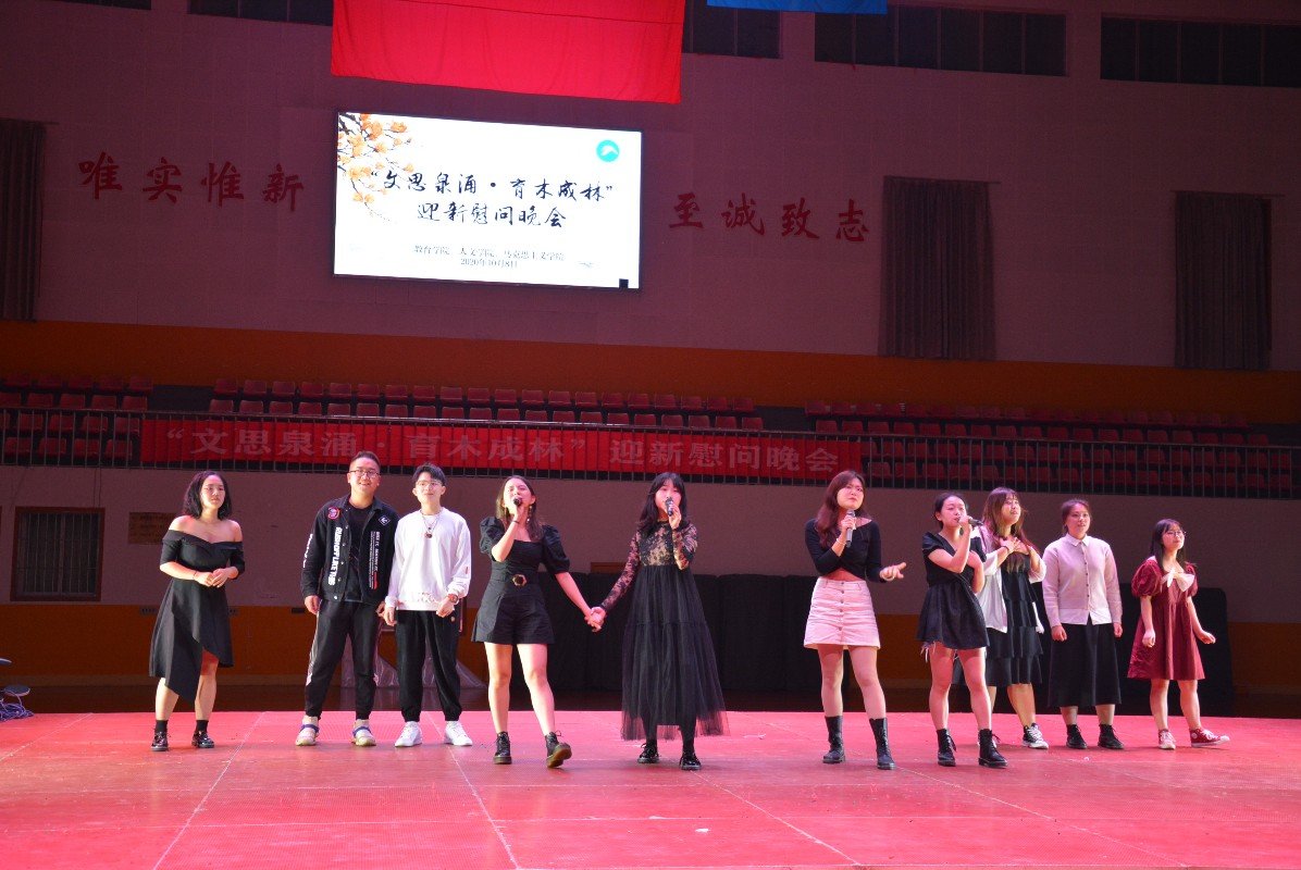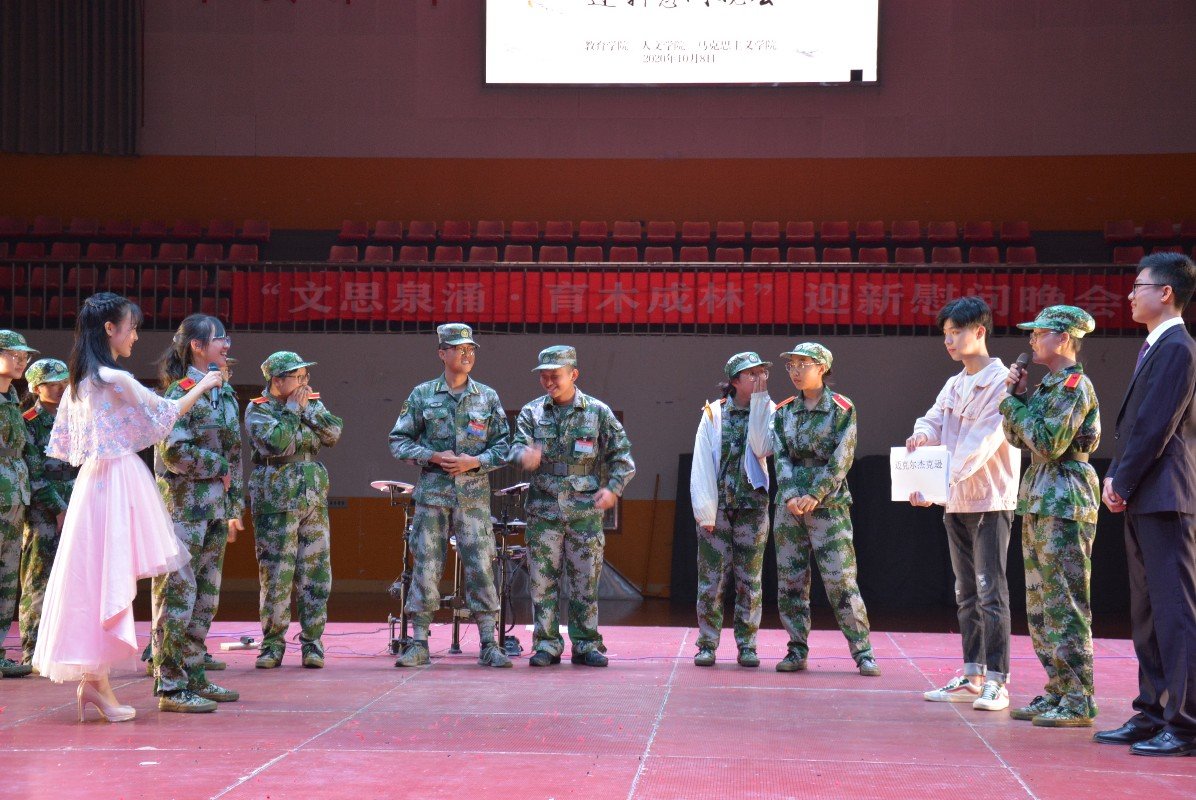 10月8号晚上19:00,在北校体育馆,教育学院、人文学院和马克思主义学院联合举办了“文思泉涌?育木成林”军训慰问演出暨迎新晚会。我院党委副书记刘辉亚,人文学院20级新生辅导员曾思妍、20级新生辅导员杜萌,马克思主义学院党委副书记莫江平、学工办主任刘哲、团委书记钟声,各学院主席团代表、艺术团前辈以及2020级全体新生参观演出。