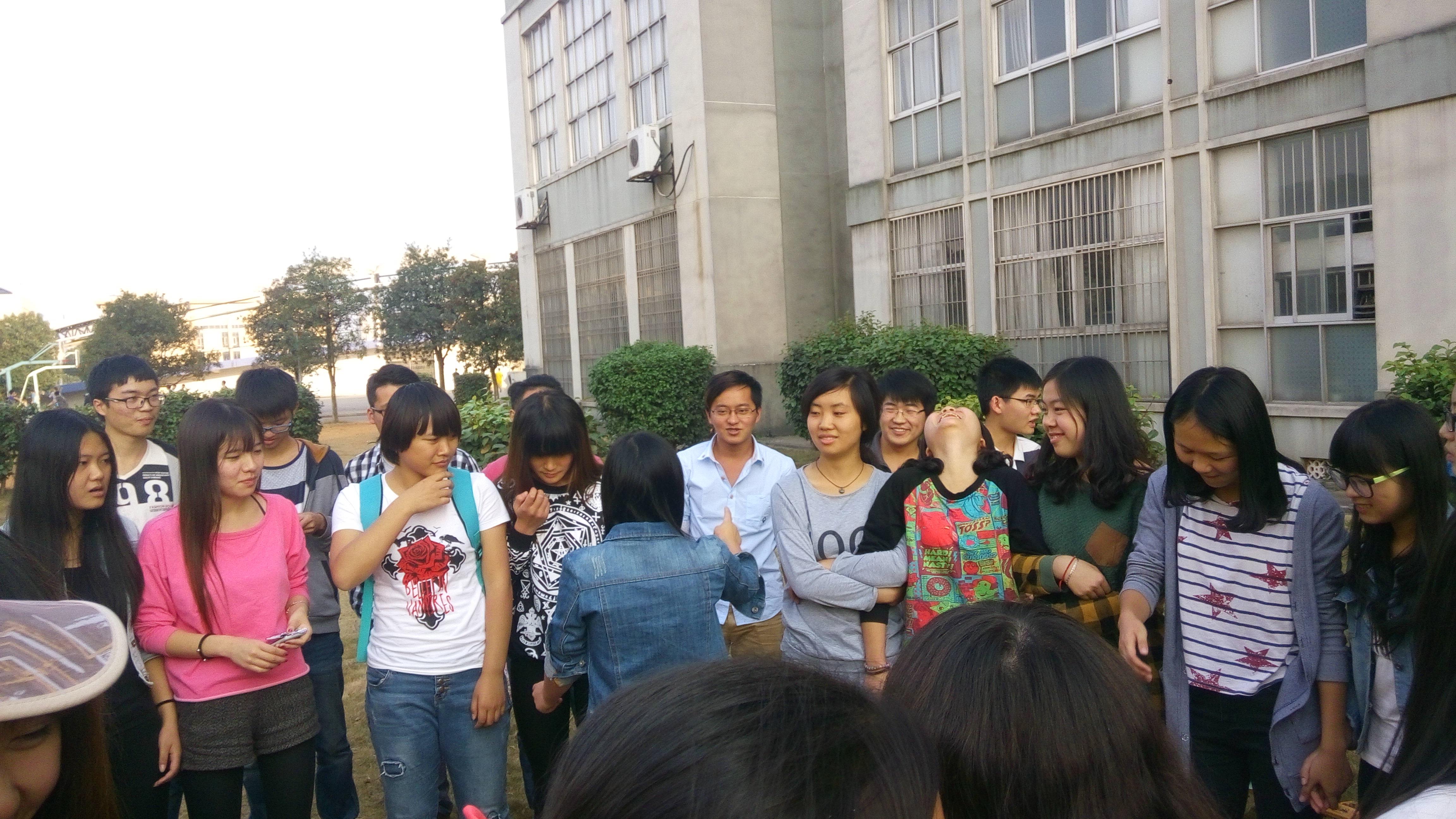 为了响应关于“走下网络,走出宿舍,走进操向”的主题团组织生活会,也为了促进班级专业之间同学的友谊,2014年10月24号下午,在教育学院应用心理学2班与土木学院工程力学1班的班长团支书的组织下,两个班的同学在外国语学院后面草坪上进行了欢快有趣的联谊活动。