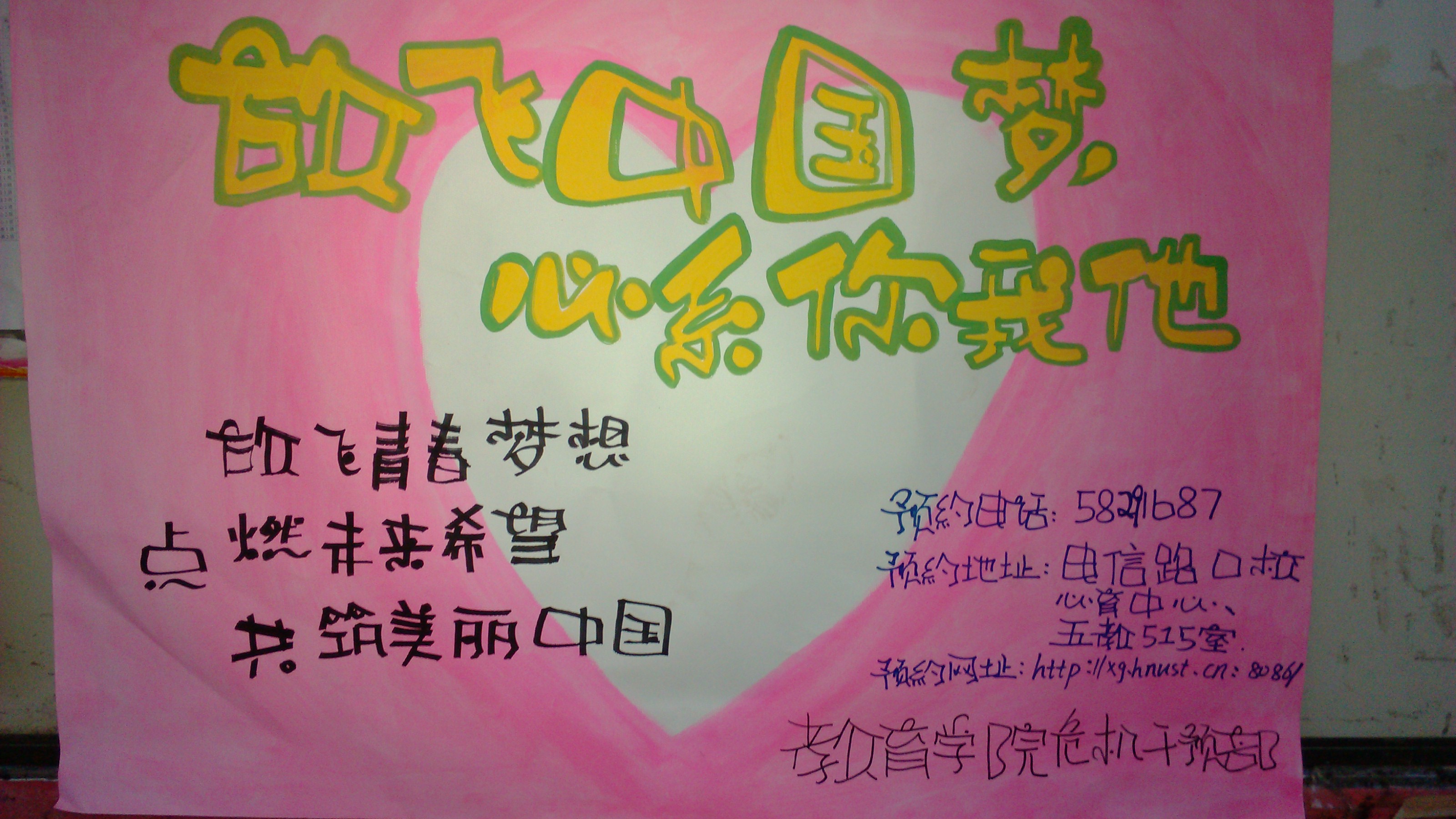 放飞中国梦,心系你我他。新时期,我们的中国梦正在实现,这是不仅仅是中华民族的梦想,也是每一中国人的梦想,更是我们每一位正值青春之际的大学生的梦想。放飞青春梦想,点燃未来希望,共筑美丽中国,教育学院危机干预部举行关于“中国梦”的海报展活动。