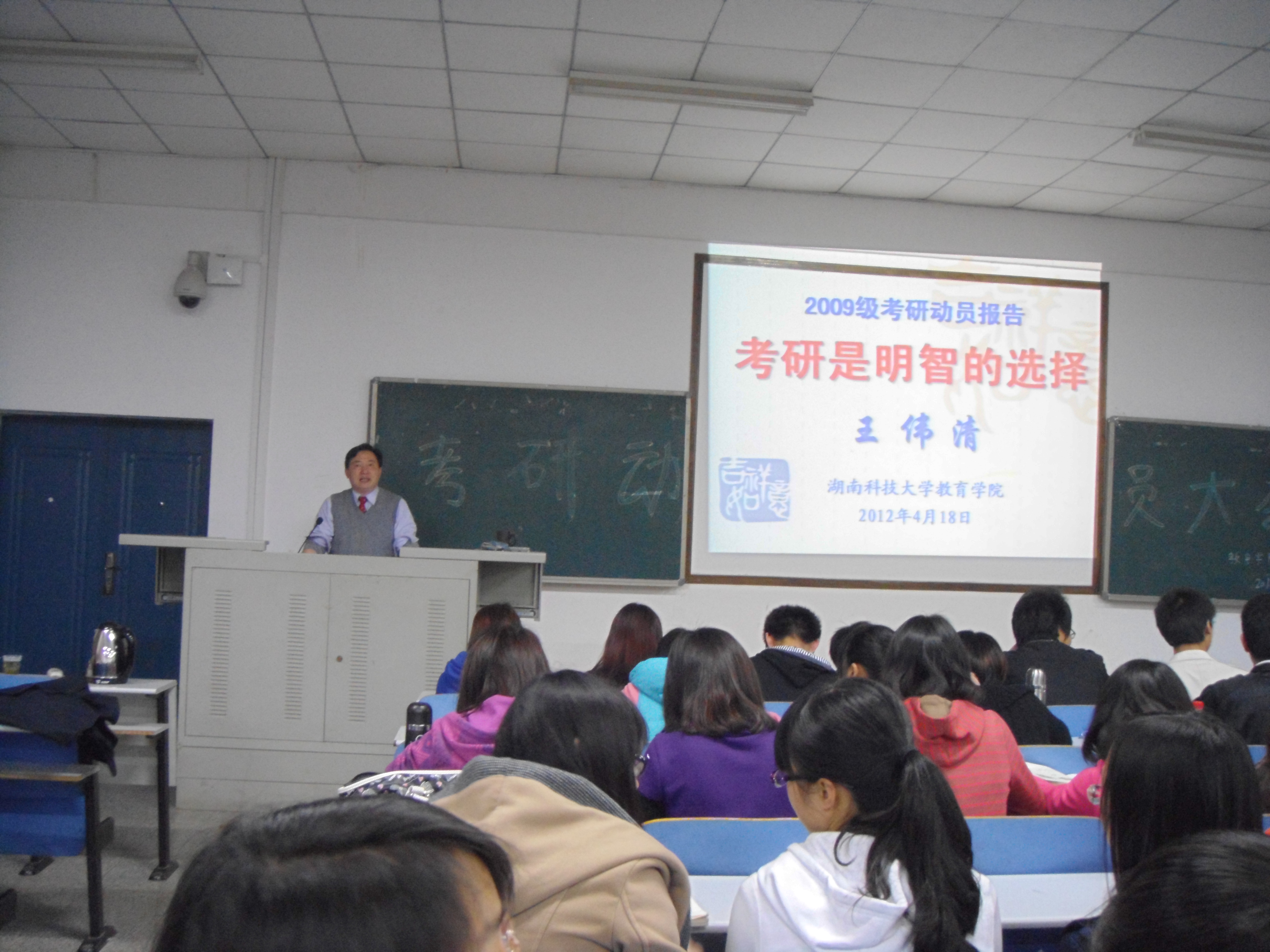 为了让09级的同学们更好地了解考研的形势政策和备考的相关事宜,让考研之行得心应手,4月19日晚19时整,由教育学院学习研究部主办的09级考研动员大会在八教1-3顺利举行,教育学院党委副书记王伟清出席讲座并作重要讲话。