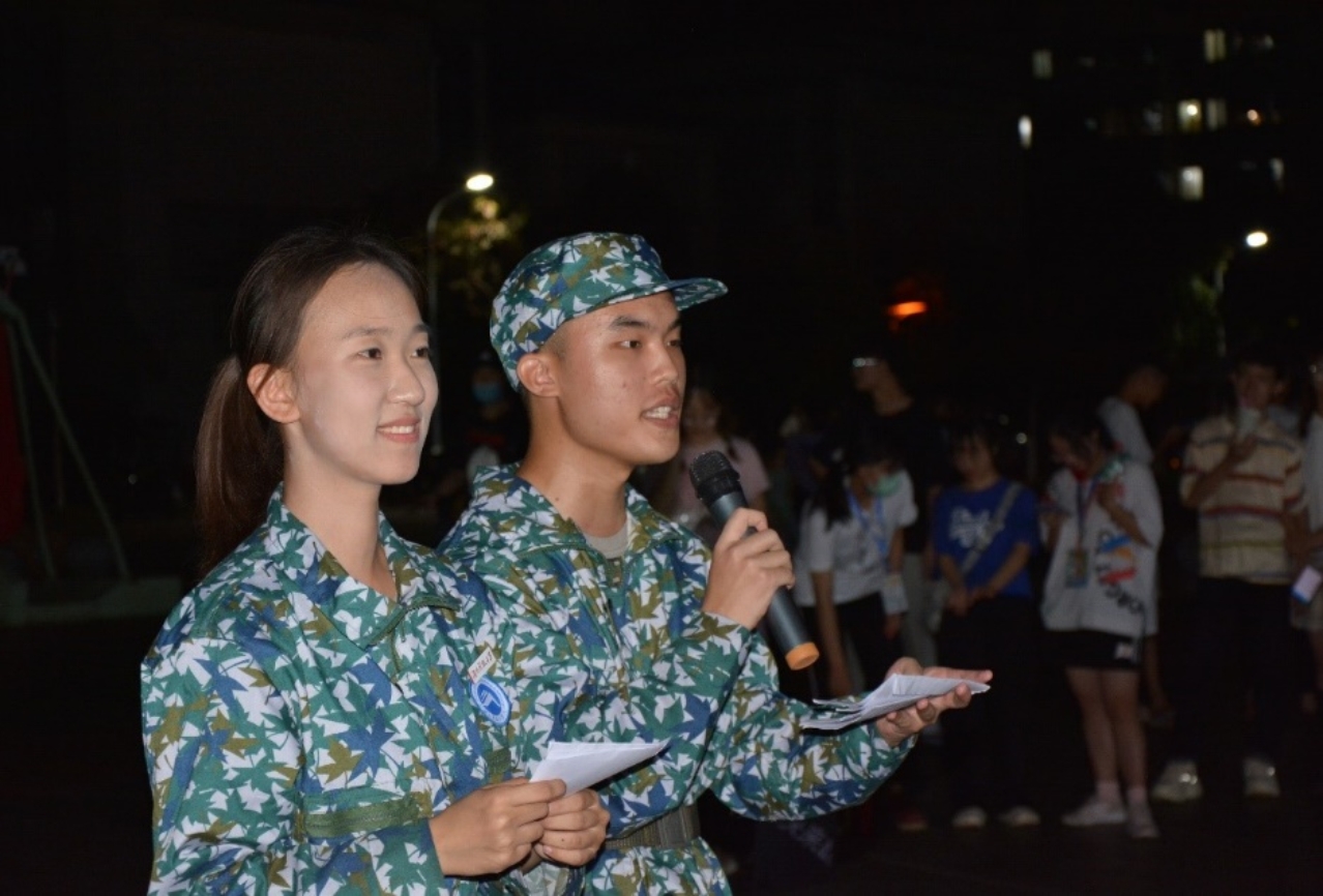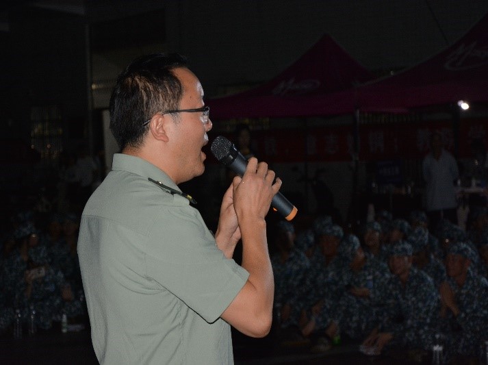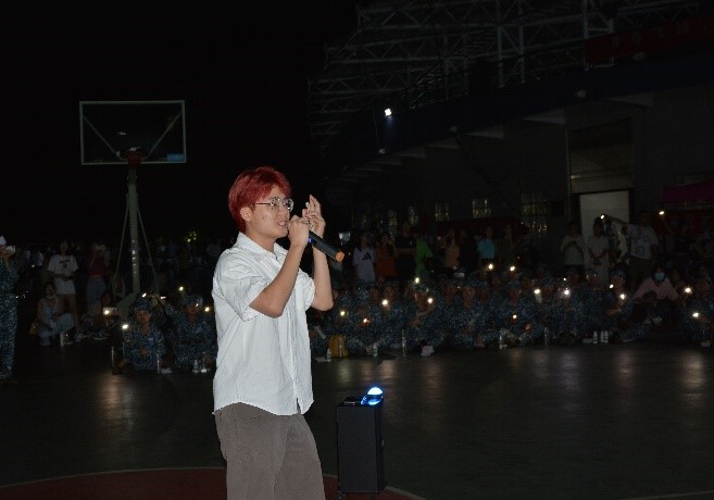 晚会以2021级应用心理学三班的刁英超的独唱歌曲《我还年轻我还年轻》开场。轻快摇滚的曲风氛围感满满,将同学们立刻点燃。歌曲过后,李炳煌问到:“大家想家了吗?”“想。”“吃点月饼就好了”。随后李炳煌、刘辉亚及学生干部们给全体新生发放月饼,以表节日祝福。“掌声不够热烈啊”…在一阵阵掌声中,刘辉亚代表学院给教官们分发中秋月饼礼盒。刘辉亚谈及军训,问道”军训累不累?“同学们表示累但可以坚持。又恰逢中秋,希望同学们可以给爸爸妈妈打个电话,送上节日祝福。其次,希望同学们可以迅速融入教育学院这个大集体,在日后的学习生活中取得好成绩。