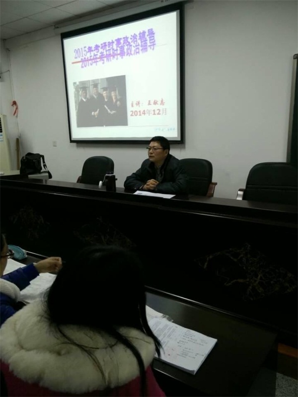 为方便考研学子备考政治科目,精确把握难点、要点,教育学院诚邀王献志教授于12月11日晚七点到八教408为我院考研学子进行2015考研时事政治辅导讲座。