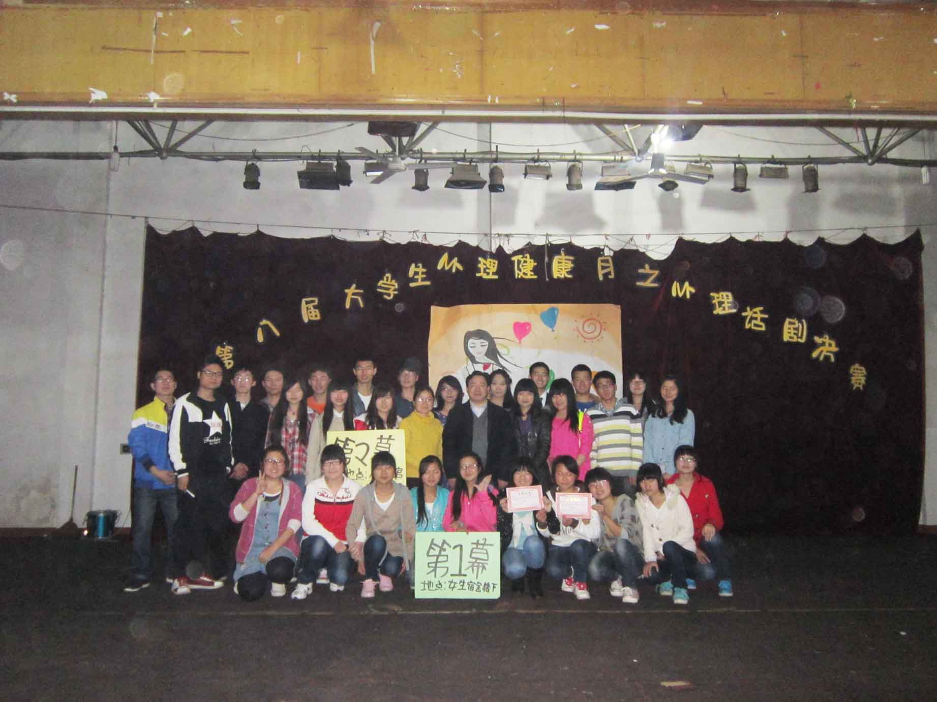 释放心灵,展现自我。在主持人的开场白后,比赛精彩开始。第一个出场的是由12小教3班带来的《心路》,其主题凸显了当今一些大学生嫌贫爱富、攀比、脆弱的心理问题,他们的表演拨动了观众们的心弦,赢得了观众的阵阵喝彩,将赛场的气氛推向了高点。接着由12小教1班出演了《成长》,在压抑的音乐声中,成功的演绎了一个屡屡受挫,心灰意冷之下准备结束生命之时,在身边同学的感化下,最终放弃轻生的念头,重拾信心勇敢走下去的大学生形象。应心3班和应心1班表演的《一直都在》和《眼前阴影,身后阳光》,《一直都在》讲述了一个创业者在一起创业的朋友与女友的不解的双重打击下,内心善良与邪恶展开了一场生死之间的较量。《眼前阴影,身后阳光》演绎的则是一个豁达的独臂画家为离家出走的学生、失意的老总解惑的故事。