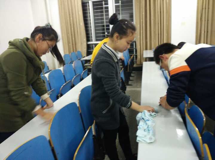 清除桌面涂鸦,创造良好课堂环境。2015年11月14日星期六晚,教育学院青年志愿团在第八教学楼开展清理教室志愿活动。