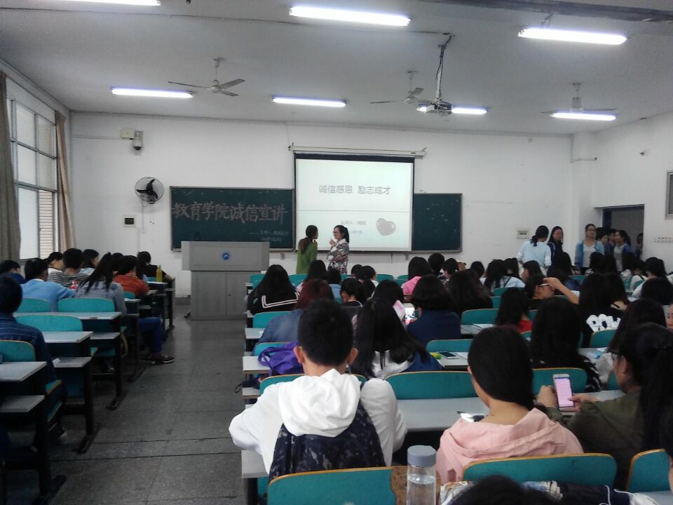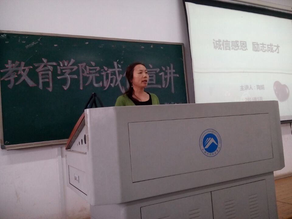 2016年5月20日星期五下午2:50,湖南太阳成集团tyc122cc入口在九教208举行以“诚信感恩,励志成才”为主题的诚信宣讲大会,主讲老师为能源学院的陶娟老师。参与本次会议的有教育学院学工办尹琼芳老师及教育学院13级、14级、15级各班贫困生代表,一场关于诚信与感恩的教育讲座就起拉开帷幕。
