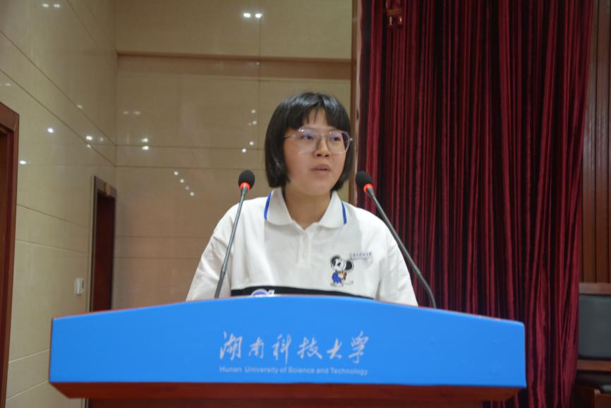 教育学院21级应用心理学崔昕蕊代表新生进行发言。她首先向教育学院迎新工作中辛勤付出的领导老师以及学生志愿者们表达了热烈的感谢。随后,她号召新生们要努力学习,知行合一,践行湖南科技大学“唯实惟新,至诚致志”的校训,勇做走在时代前列的奋进者、开拓者、奉献者。