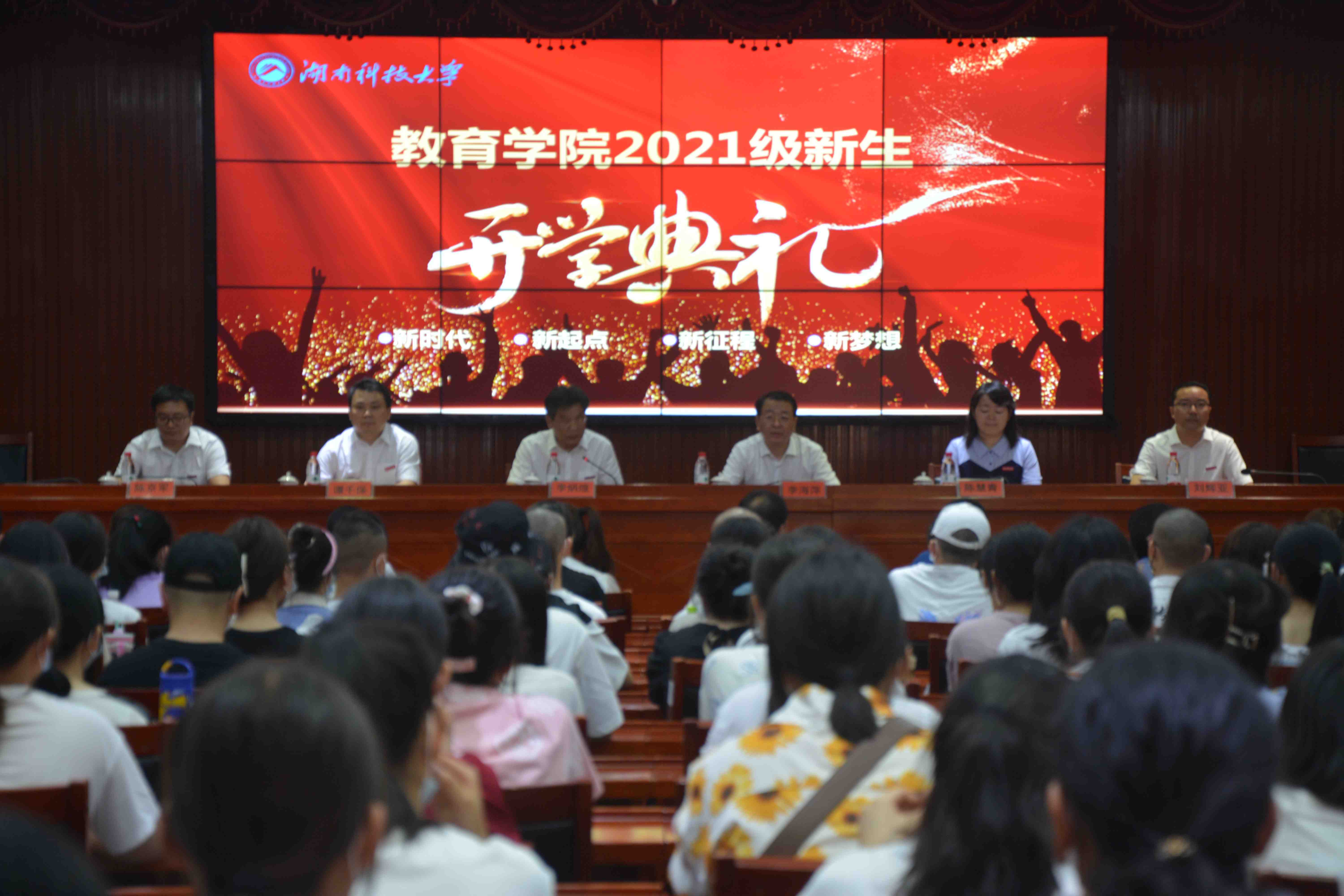 9月18日中午,教育学院2021级新生开学典礼在立德楼五楼报告厅举行。典礼由学院党委书记李炳煌主持,院长李海萍、副院长陈慧青、谭千保、陈京军以及党委副书记刘辉亚出席,学院各系系主任、党政办主任、教务办主任、各年级辅导员、新生班主任、主席团成员、养成辅导员以及21级全体新生与会。