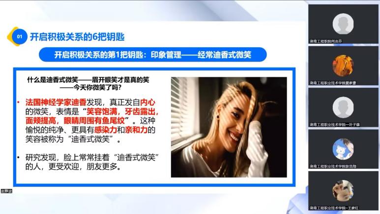 为帮助大学生改善社会生活中与他人的关系,保持良好的心理健康状况,5月15日,我院组织20-22级全体同学线上观看了“在关系中蜕变与成长”主题讲座。本次讲座由湖南省高校大学生心理健康教育研究会湖南省社科普及基地主办,博士生导师赵静波担任主讲嘉宾,湖南工程职院教师何炎芬担任主持人。