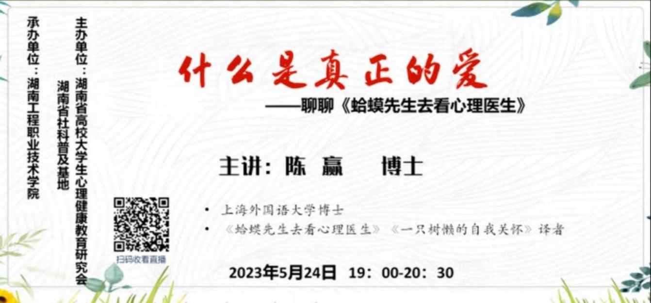 为更好地迎接“5.25”大学生心理健康日,进一步做好大学生心理健康宣传普及教育,引导大学生勇敢探索内心世界,在更加包容的环境下学会倾听,拥有良好的心理健康状况,5月24日,我院组织21级全体同学在线上观看了“什么是真正的爱”主题讲座。本次讲座由湖南省高校大学生心理健康教育研究会湖南省社科普及基地主办,上海外国语学院陈赢博士担任主讲嘉宾,湖南工程职院教师何炎芬担任主持人。