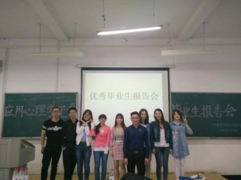 微风驱散雾霾,阳光穿透雨露。2016年5月27日,久雨初晴,教育学院优秀毕业生报告会终场——2012级应用心理学专业优秀毕业生分享会在第八教学楼4-1顺利举行。我院2012级优秀学生代表吴厚涛、苏维维、毛晗婧、林红娟依次为2015级应用心理学专业同学进行了各自的经验分享。学生会副主席刘亚琨、杨柠遥及就业服务部副部长郝显露出席现场。