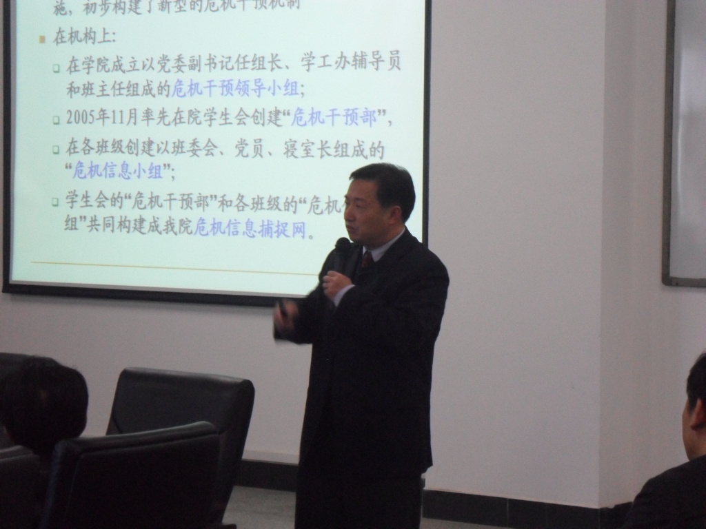由于最近各大高校屡次发生学生自残自杀事件,引起了社会各界对当前高校学生管理危机事件的深刻反思。王书记在大会上发言说:“这不仅仅是心理健康的问题,而且还包括了人身,财产的安全问题,这更是危机信息的把握不够和工作不到位所导致的。我院为了及时预防此类危机事件的发生,做到防患于未然,将其‘扼杀‘在萌芽期,早在2005年就成立了危机干预机构,注重教育疏导,提高干预效能,注重干预源头。防止危机转化。在危机信息方面做出了成效,对危机事件的处理起到了良好的作用。”