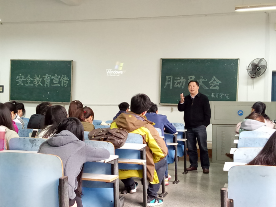 会议前期练老师为大家讲解了此次安全教育宣传月目的及重要性,希望引起大家足够的重视。并向大家解读安全教育宣传月的几点主要内容。第一:防火、防盗、防被盗、防交通事故、防人身侵害、防中毒、防传销、防自然灾害等安全知识教育。第二:严明校纪校规,加大学生行为管理的力度。第三:加强疾病预防、饮食卫生安全教育,保障师生身体健康。第四:加强学生宿舍安全管理工作,确保学生宿舍安全。第五:努力提高广大学生心理健康意识和自我调节能力。第六:禁止参加邪教及危害国家安全活动,加强师生自我保护意识。在讲解过程中,练老师还紧接着讲了几个经典的例子,使加强安全防护的观念深入每一位在场同学的心中。