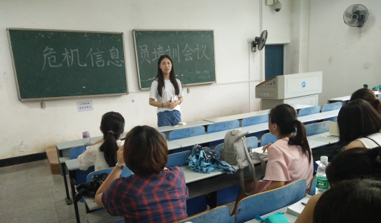 2016年6月28日教育学院危机干预部在八教1-4组织召开了13级、14级、15级新一届危机信息员培训大会。本次会议的主要目的是为大家讲解危机干预部的日常工作,提高新一届危机信息员的危机意识,培养其在细节处发现危机信息的能力。出席本次会议的有:教育学院心理辅导员老师练素华,团委学生会副主席兼危机干预部部长殷云洁同学,以及危机干预部的全体成员。会议由危机干预部部长主持召开。