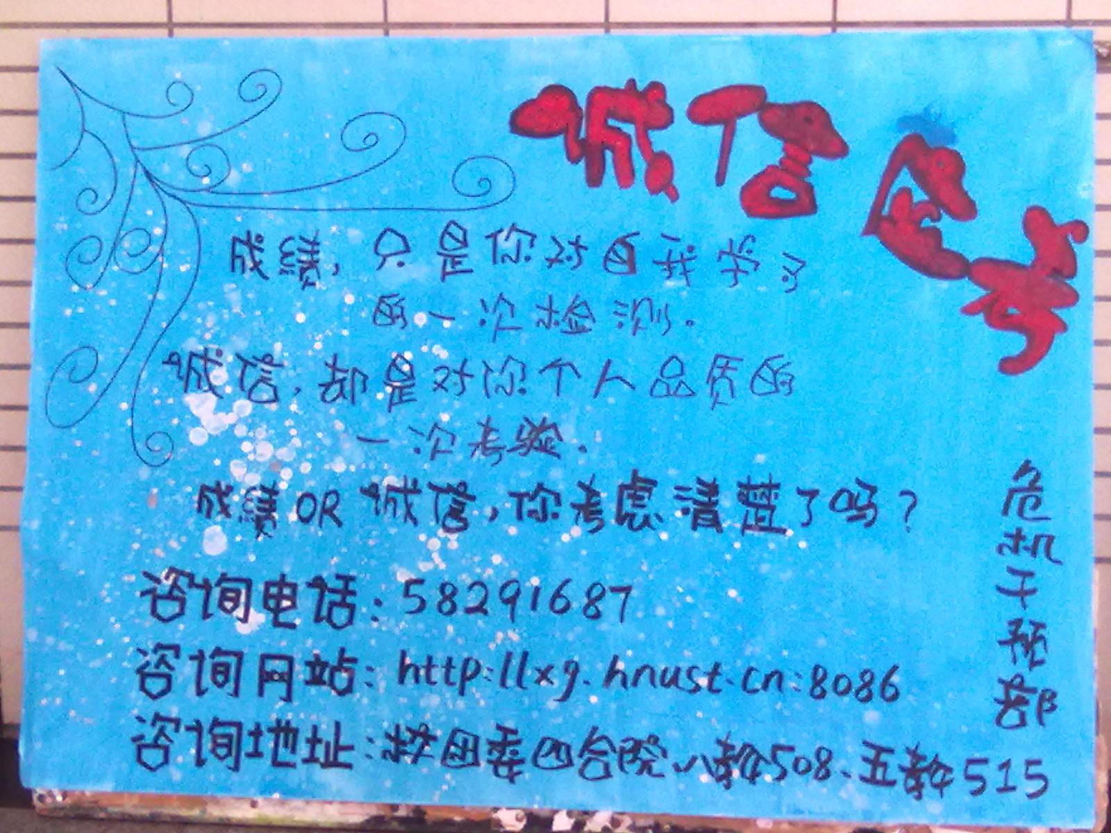 您所在的位置: 首页» 学生工作» 日常管理 诚信应考,你我参与 时间:2012-06-12 00:00:00 6月份是考试月,诚信应考是我们每个人都必须遵守的,为了让每位同学积极参与这次活动,以身作则,教育学院团委学生会危机干预部,为此特别制作海报向大家宣传,希望每个教育学子在考试中,做好成绩与诚信的评估,用实力取得成绩,而不是为了成绩失去诚信。