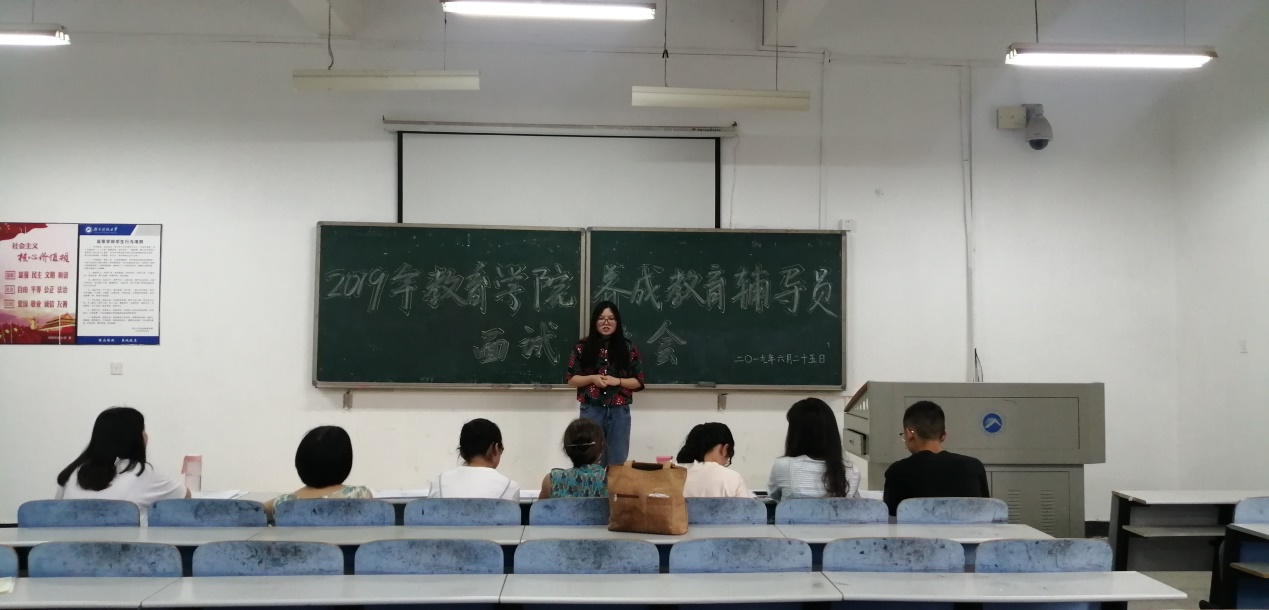 为加强人才培养,发挥典型示范作用,做好迎接2019级大一新生的工作,2019年6月25日下午2:30,教育学院养成教育辅导员面试大会于八教3-6举行。出席本次会议的嘉宾有学工办辅导老师练素华、尹琼芳以及第二十一届团委学生会主席团的全体成员。