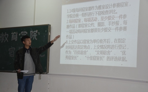 纪检宿管部副部长刘亚琨对第九届宿舍文化艺术节具体活动方案要求进行了详细介绍。此次活动分六个部分进行,分别是“学习型宿舍”评比、“崇尚法治 践行文明”宿舍座谈会、雅室设计、摄影大赛、手抄报编辑大赛、学生宿舍安全知识图文展。值得一提的是,“学习型宿舍”评比是今年活动的创新点,是对二年级以上学生宿舍开展的活动,以宿舍成员的学习成绩和获奖情况为主要评判标准,这项活动不仅是宿舍文化艺术节的一部分,更是加强学风建设的措施之一。