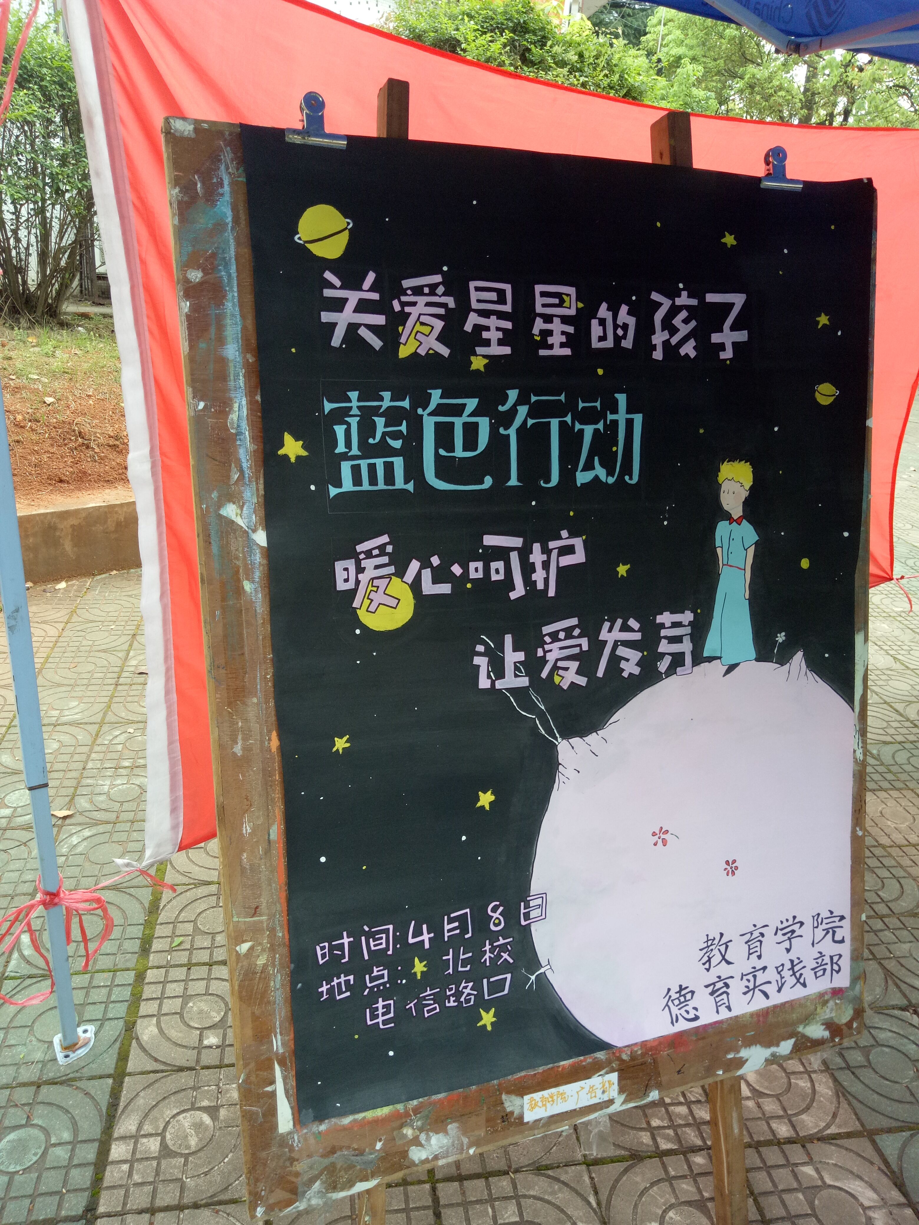 湘潭市岳塘区亲园培智学校有两名患自闭症的孩子,他们家庭情况特殊,尤其需要大众及社会的帮助。为此教育学院青年志愿团自2017年4月8日晨8:00至傍晚17:00在北校区电信路口举行了“蓝色活动”——关爱自闭症儿童宣传及募捐活动。