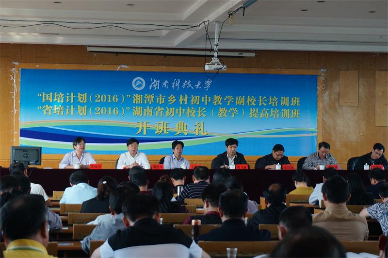 2016年10月10日上午8点30分,湖南太阳成集团tyc122cc入口2016年“国培计划(2016)”湘潭市乡村初中教学副校长培训班和“省培计划(2016)”湖南省初中校长(教学)提高培训班在学术交流中心五楼会议厅举行开班典礼。湖南科技大学副校长周飞跃教授、湘乡市送培单位、继续教育学院、教育学院相关负责人以及湘潭市乡村初中教学副校长和湖南省初中校长等140名学员出席了本次开班典礼。典礼由教育学院党委书记谭建平教授主持。