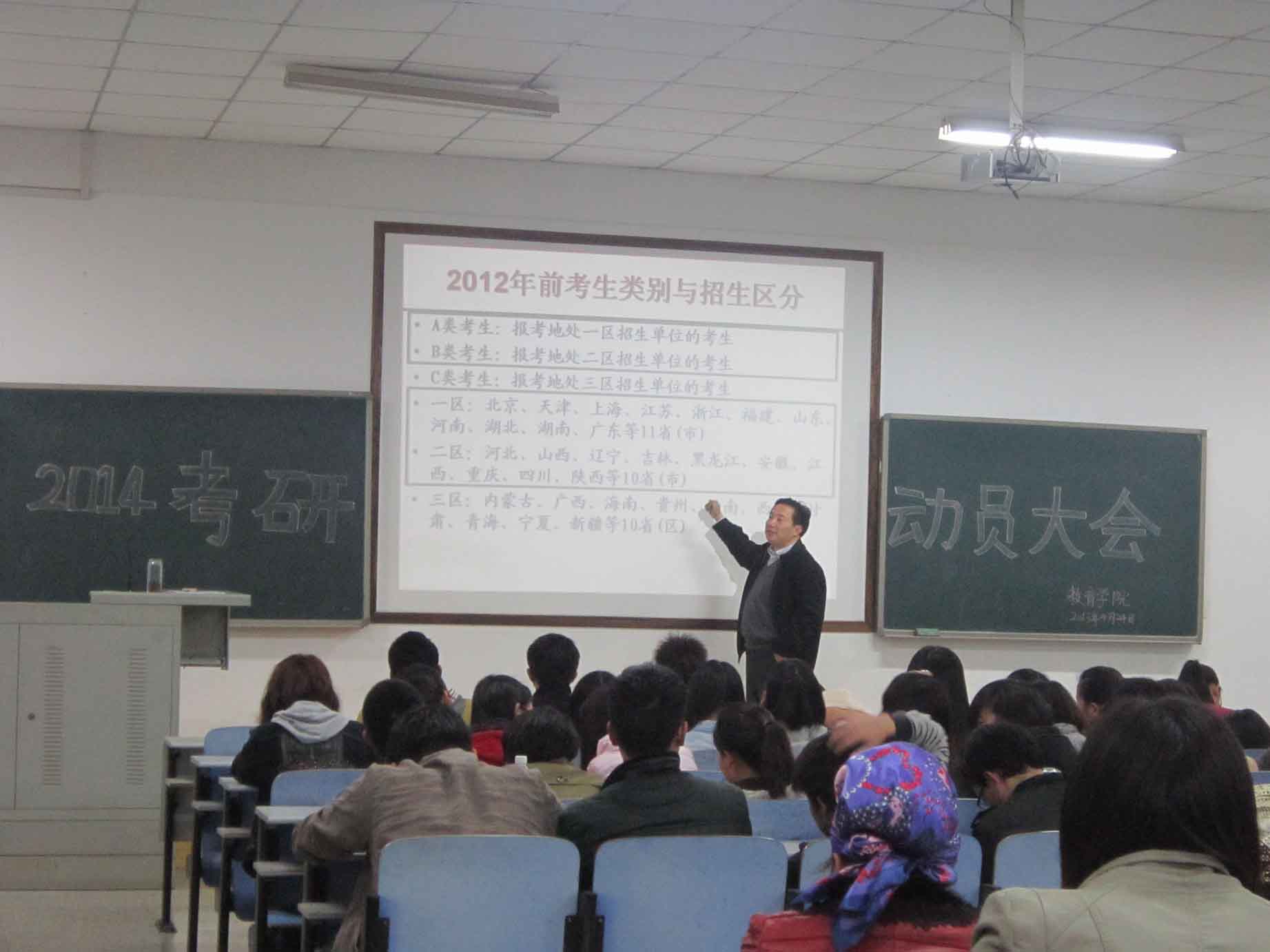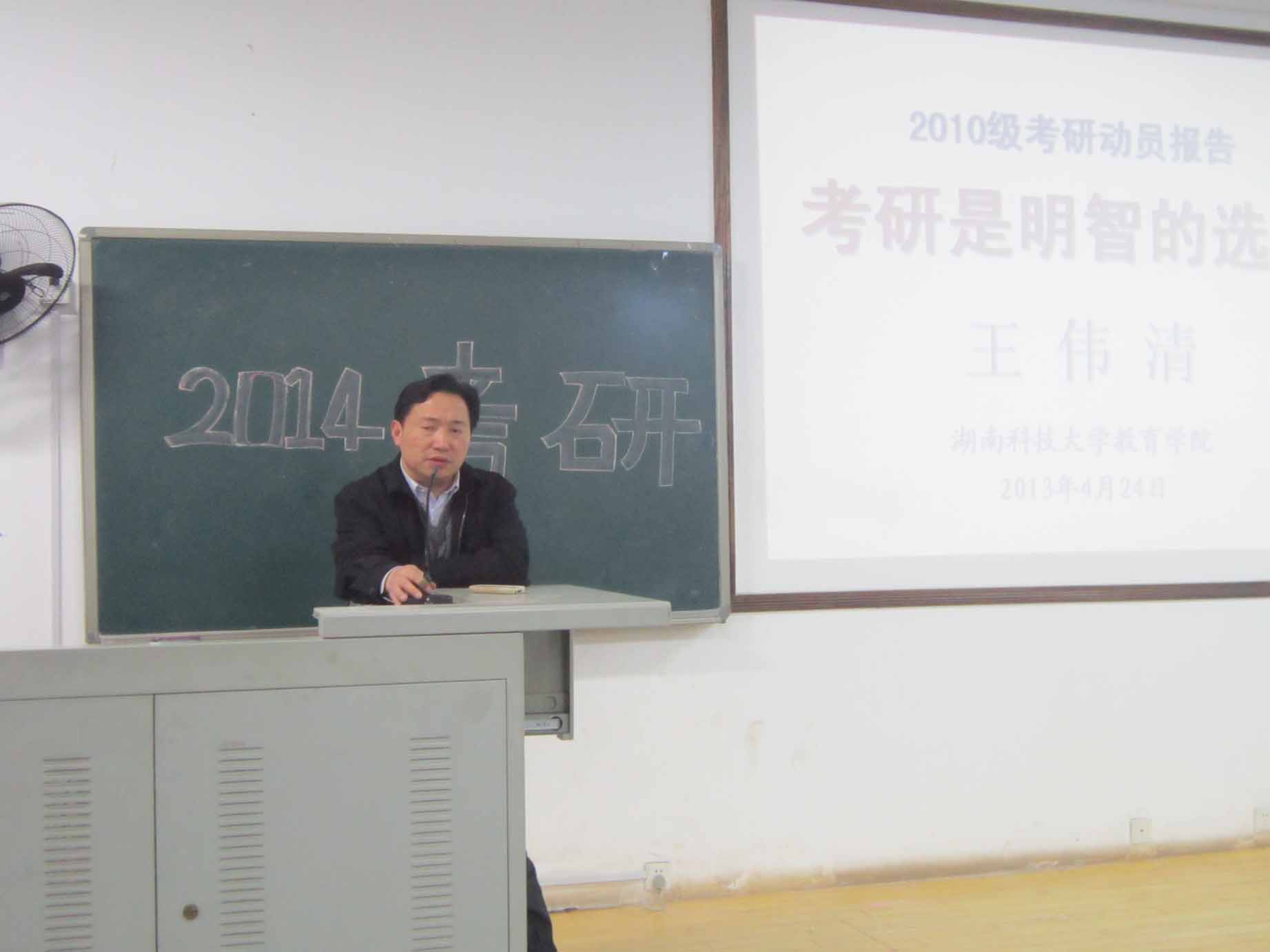 人生路口,选择何方。这是每一个毕业生所面临的问题。4月24日晚7:00,教育学院党委副书记王伟清在百忙之中,为了不改变计划带病为2014年即将毕业的学生做了考研动员大会,鼓励大家做好正确的选择,走出自己的精彩人生之路。