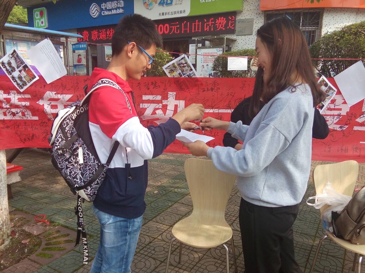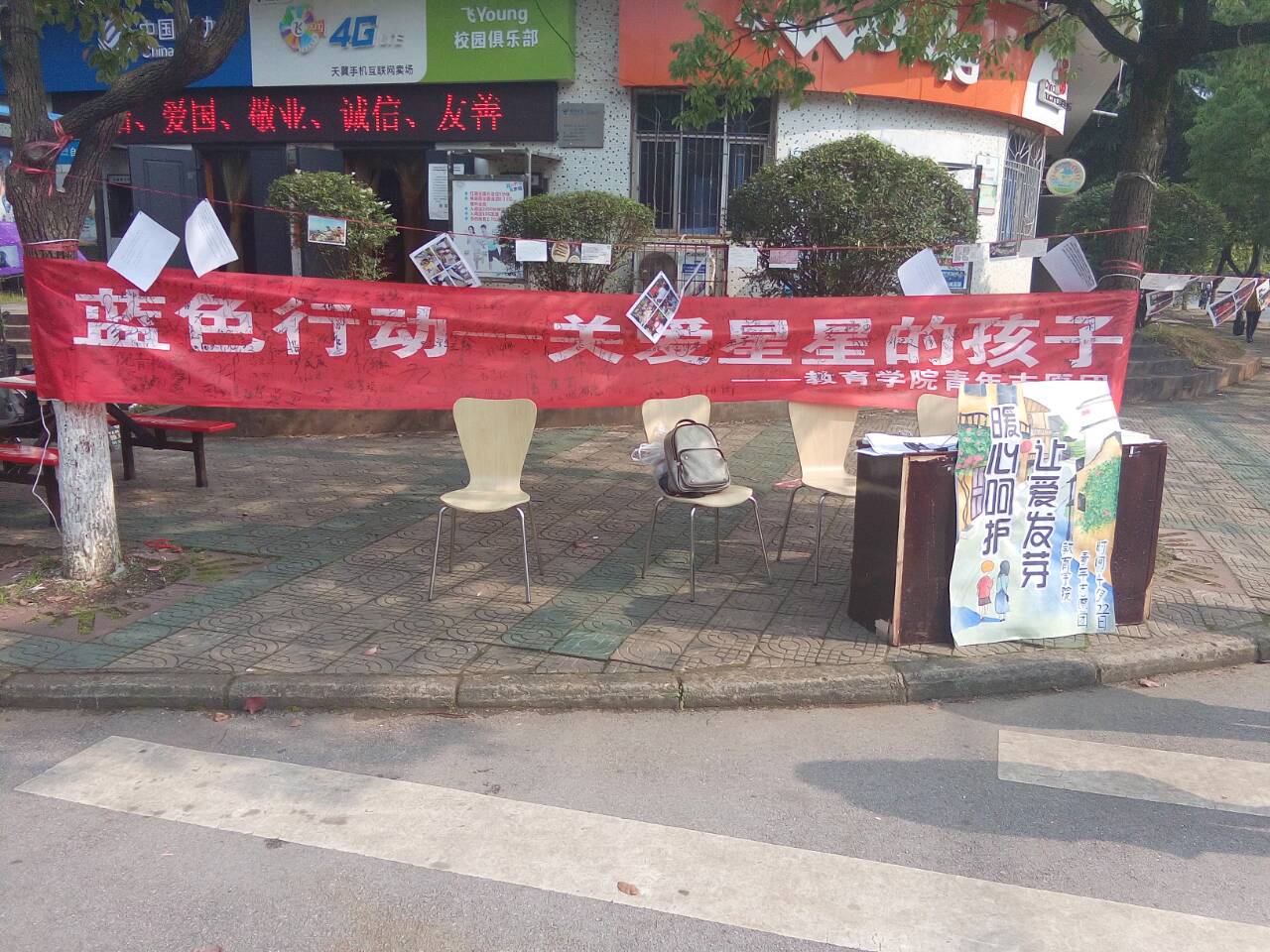 “你好,能打扰一下做一个关于自闭症儿童的调查问卷吗?”,“你好,能在关爱自闭症儿童的条幅上签一下名字吗?”2016年4月27日,在北校电信路口有那么一群可爱的人,拿着问卷和签字笔不断地向路过的学生发出邀请,日头渐渐西斜,人来人往却不曾停歇,在这里,由教育学院青年志愿团的志愿者们开展的“蓝色行动——关爱星星的孩子”志愿活动正在有序进行着。