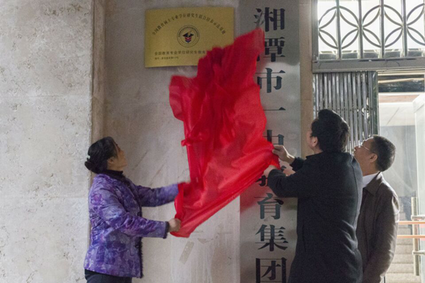会后,与会领导在湘潭市第一中学办公楼前为示范基地揭牌,并和与会代表集体合照。
