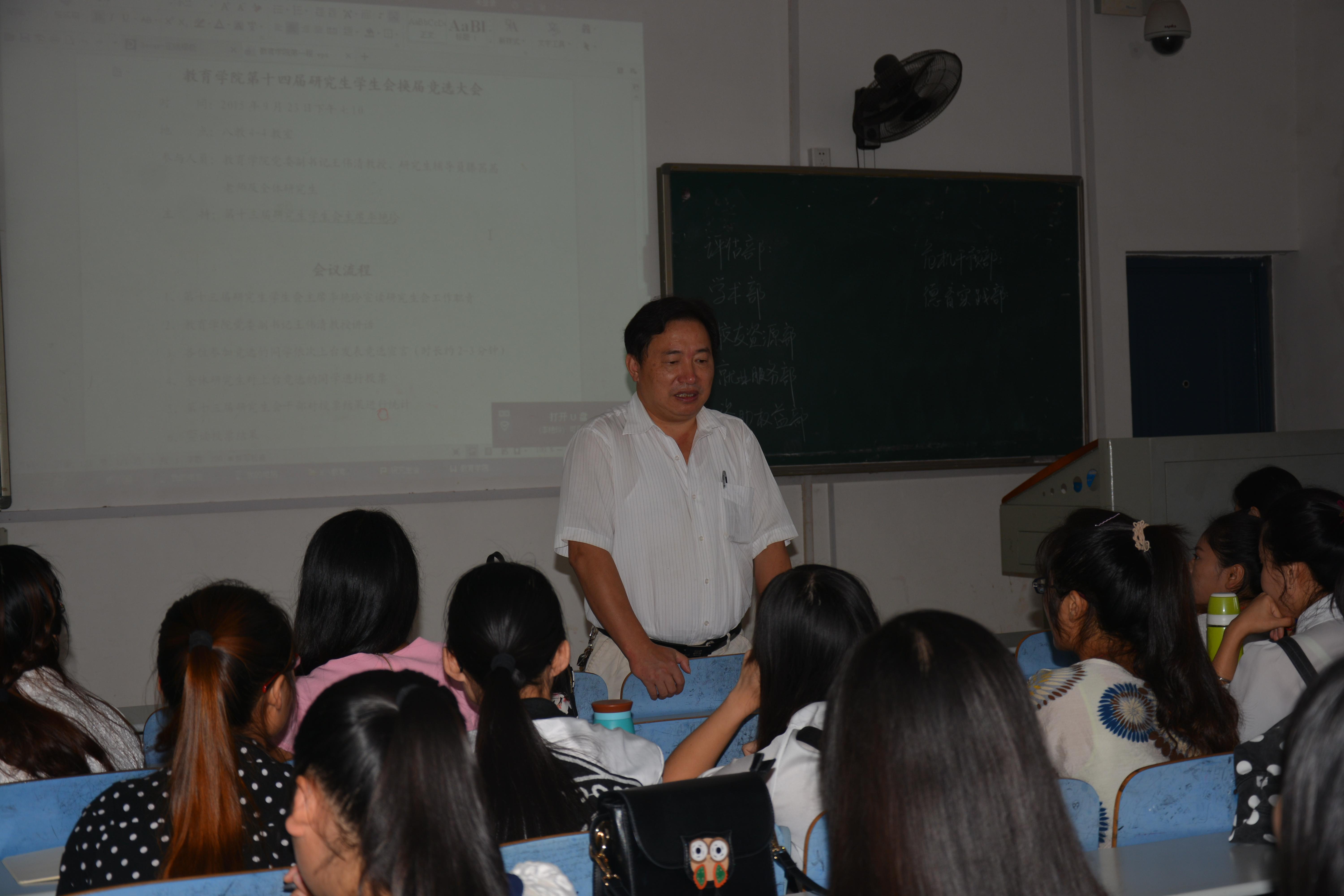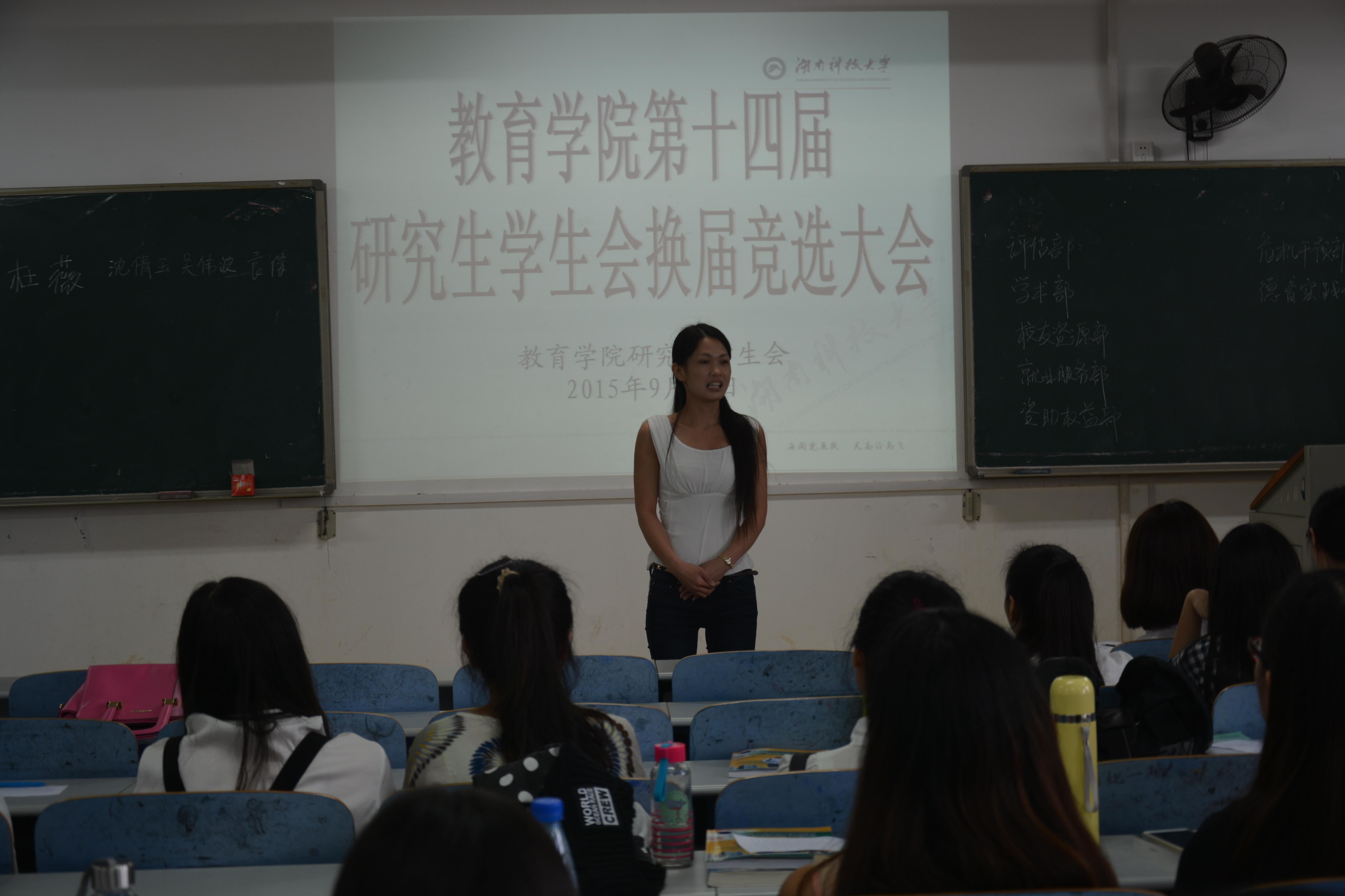 2015年9月23号16:30,湖南太阳成集团tyc122cc入口第十四届研究生学生会在八教4-4举办了换届竞选大会。教育学院党委副书记王伟清教授、研究生辅导员滕茜茜老师出席此次会议,参会的还有第十三届研究生会的主席团成员、相关部门部长、副部长以及2015级全体研究生。本次大会由第十三届研究生会主席李艳玲主持。