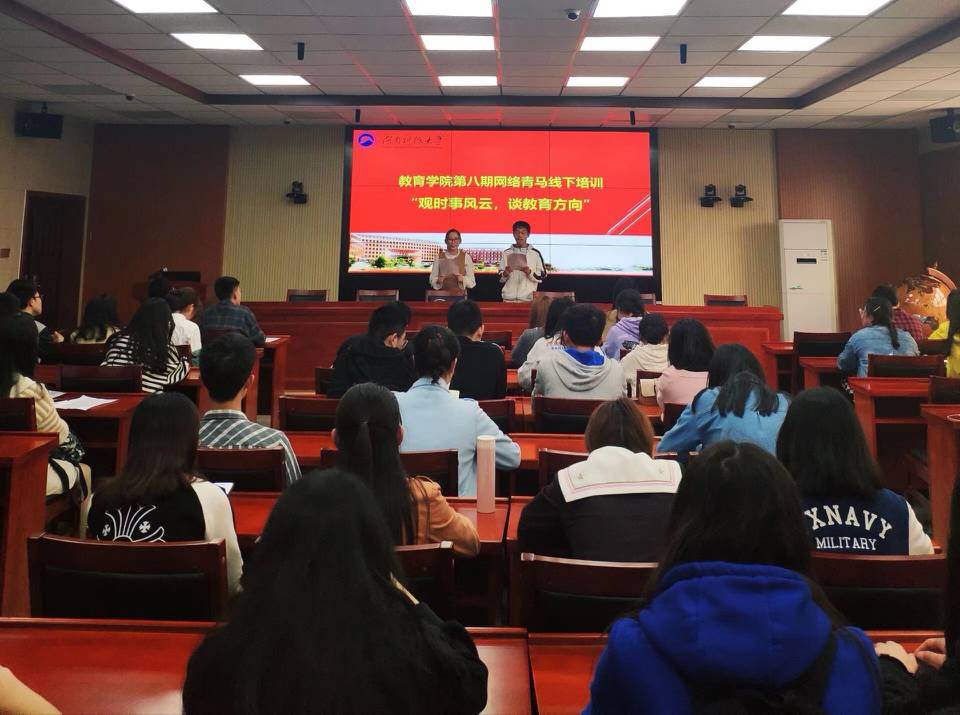 4月16日下午三点十分,教育学院第八期青马培训班线下‘’观时事风云,谈教育方向"座谈会在八教308如期举行。
