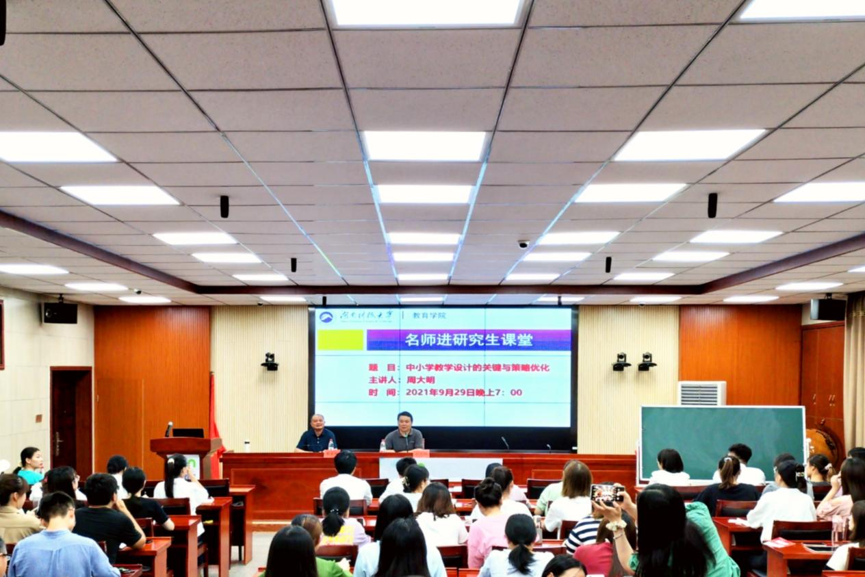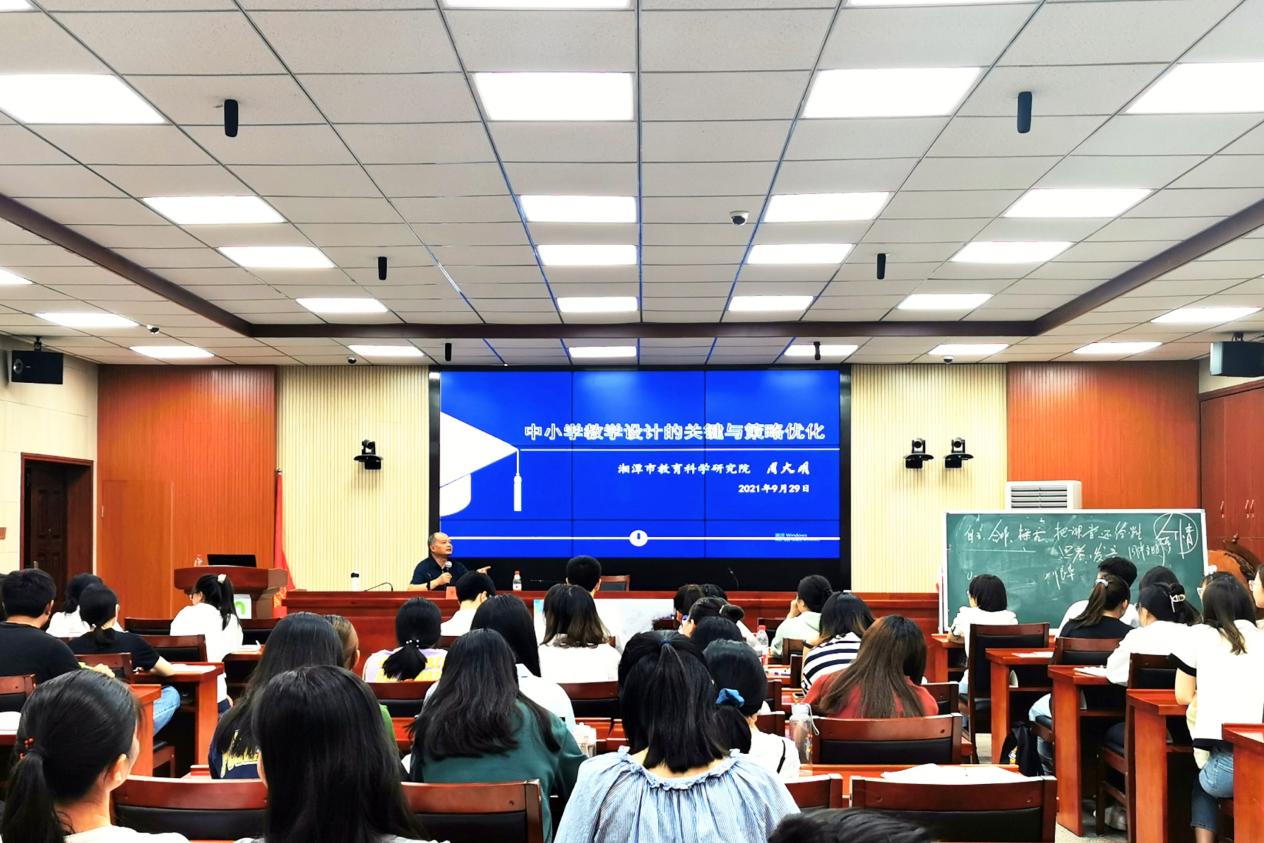 9月29日晚,湘潭市教育科学研究院院长、党委书记、特级教师周大明应邀莅临我院,做客“名师进研究生课堂”,在第八教学楼308学术报告厅为我院师生带来《中小学教学设计的关键与策略优化》的主题讲座。讲座由教育学院副院长谭千保主持,教育学院2020级学术型硕士研究生、教育硕士专业学位研究生和我校推荐参加湖南省研究生教学技能大赛的选手到场聆听学习。