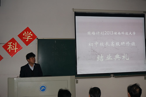 2013年10月19日上午,由我校教育学院承办的“国培计划(2013)”《初中校长高级研修班》结业典礼在第九教学楼108教室举行。结业典礼由教育学院党委书记谭建平教授主持,教育学院院长陈春萍教授,教育学院副院长、国培办主任陈坤华教授等相关领导与工作人员出席了典礼活动。
