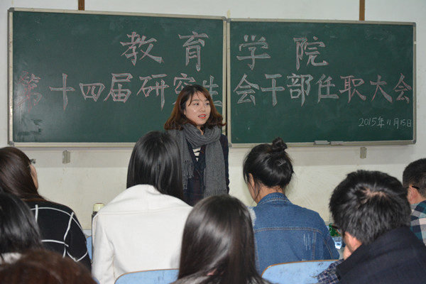 11月15日晚上7点,教育学院第十四届研究生会干部任职大会于八教1-3教室举行。我院党委副书记王伟清、研究生辅导员滕茜茜应邀出席,第十三届研究生会干部和2015级研究生到场参加本次大会,会议由教育学院第十四届研究生会副主席杜薇主持。