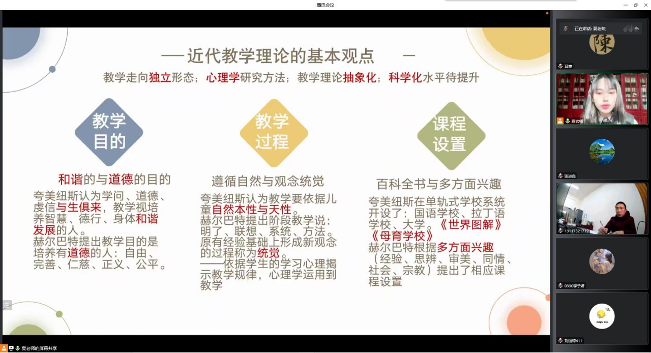 夏青博士从西方教学理论的形成与发展、我国教学理论的发展与反思、教学的基本理论等三个方面为我们上了一节生动的课程思政示范课。在导入环节,夏青青博士结合自己与学生交流的内容引导学生注意人际沟通中的细节和礼节,从细节处落实立德树人理念。在对中西方教学理论发展历程的讲述中,聚焦到教学理论中的德育思想,关注到教学理论家们身上的道德品质、爱国情怀和为教育事业奉献一生的崇高精神,积极引导学生树立正确的国家观、民族观、历史观、文化观。在教学的基本理论部分,夏青博士对教学的概念、过程、要素、规律、原则、方法以及策略进行了系统解读,对相关概念进行了对比分析。