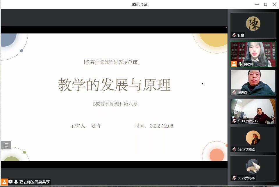 为打造课程思政示范课堂,进一步发挥课程育人功能,加强课程示范引领作用,教育学院“课程思政示范课”于2022年12月8日星期四上午以线上方式进行。示范课由湖南太阳成集团tyc122cc入口和湖南科技大学教师教育课程思政研究示范中心共同承办。教育学院夏青博士主讲,教育学院院长谭千保、教育学院教师代表、潇湘学院在读本科生共100余人线上听课。示范课由教育学院副院长张进良主持。