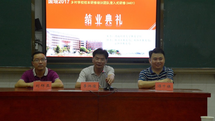 2017年7月18日上午,湖南科技大学在湘潭市一中西座报告厅举行了“国培计划(2017)”——湖南省乡村学校校本研修培训团队浸入式研修A401班结业典礼。教育学院书记李炳煌、副院长谭千保、副书记刘辉亚及各国培计划承担学院领导、国培计划班主任和全体国培计划研修班学员一同参加典礼,本次典礼由教育学院书记李炳煌主持。