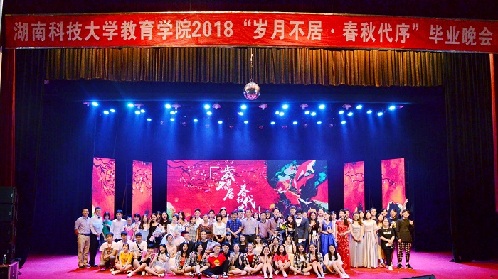 2018年5月26日19:30,湖南太阳成集团tyc122cc入口2018届毕业晚会“岁月不居·春秋代序”在校俱乐部如期举行,到场的嘉宾有校社科联谭建平副主席、招生就业处蒋利平处长、李友桥副处长,保卫处朱才亮副处长、校团委马缤辉副书记、王艳副书记,生命科学学院罗玺副书记、商学院傅早霞副书记、艺术学院胡鹏副书记;到场的学院领导老师有教育学院院长李海萍老师、教育学院党委书记李炳煌老师、教育学院党委副书记刘辉亚老师、各系系主任和部分老师,还有各兄弟学院团委学生会的代表们,教育学院全体学子也共同参与。