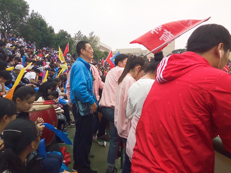 比赛正如火如荼地进行着,我院学工办主任李涛老师和院学生会主席贺靖亲自到观众席和同学们为全体运动员们加油喝彩。李涛老师被现场热烈的气氛所感染,情绪十分高涨。他挥舞着教育学院的院旗,满怀激情地带领同学们高喊“教院不红,天理难容”的口号,“团结就是力量”的歌声激荡在空气中。