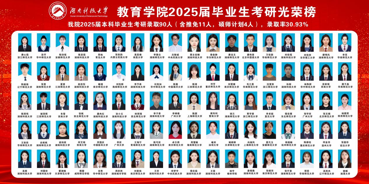千淘万漉虽辛苦,吹尽狂沙始到金。教育学院2021级学子以矢志不渝的奋斗姿态,在升学之路上绽放璀璨光芒——291名毕业生中共有90人考取硕士研究生,总体升学率超过30%,展现学院人才培养成效与学子拼搏精神。